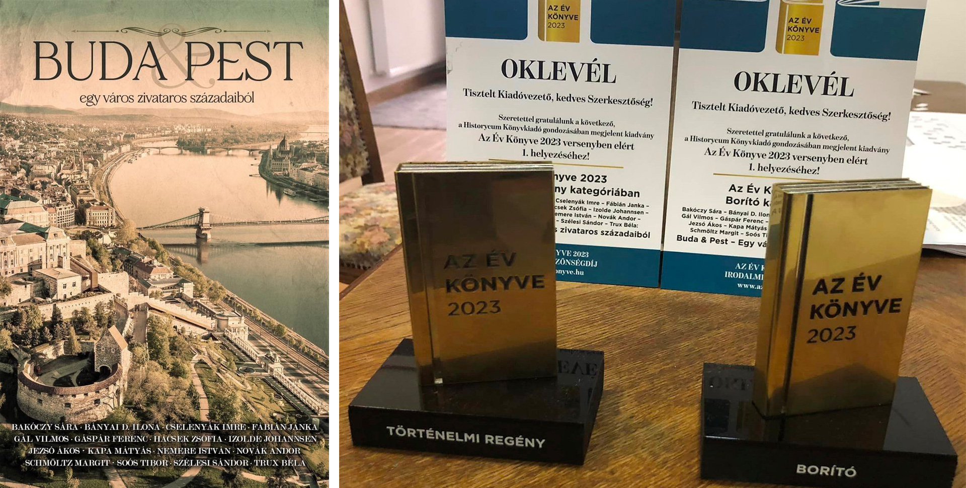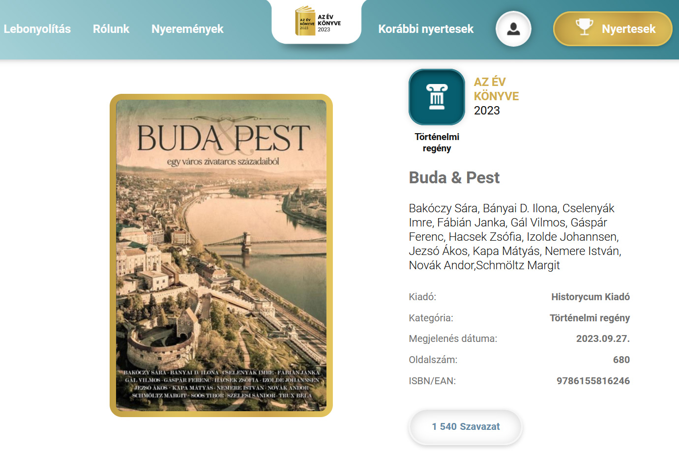 − Őszintén szólva minden nagyon gyorsan történt, alig bírtuk követni az eseményeket. Eleve szeptember vége felé jelent meg a „kis dagi”, vagyis a vaskos Buda & Pest regény, és mire föleszméltünk, a Könyvfesztiválon mind egy szálig elfogyott. Gyorsan után kellett nyomtatni, hogy a könyvek kikerülhessenek az üzletekbe. De már nyakunkon volt az Év Könyve kiírás, és bevallom nem is tudom, ilyen későn hogyan kerültünk be a jelöltek közé. Nos, ha már benevezett bennünket valaki, legkevesebb, amit tehettünk, hogy megkértük az olvasóinkat, szavazzanak ránk. És megtették, és megnyertük! Én a magam részéről nem számítottam rá. Egészen meglepett, hogy győztünk, ráadásul két kategóriában is. Tudniillik Novák Andor szerzőtársunk a könyvborítóért érdemelte ki a jeles elismerést. Ez a könyv a szerelem és tolerancia regénye. Eleddig példátlan módon tizenhat író alkotta meg. Azóta sem térünk magunkhoz, hogy mennyire imádják az olvasók! A mi dolgunk már csak annyi, hogy örüljünk és koccintsunk rá még nagyon sokszor.