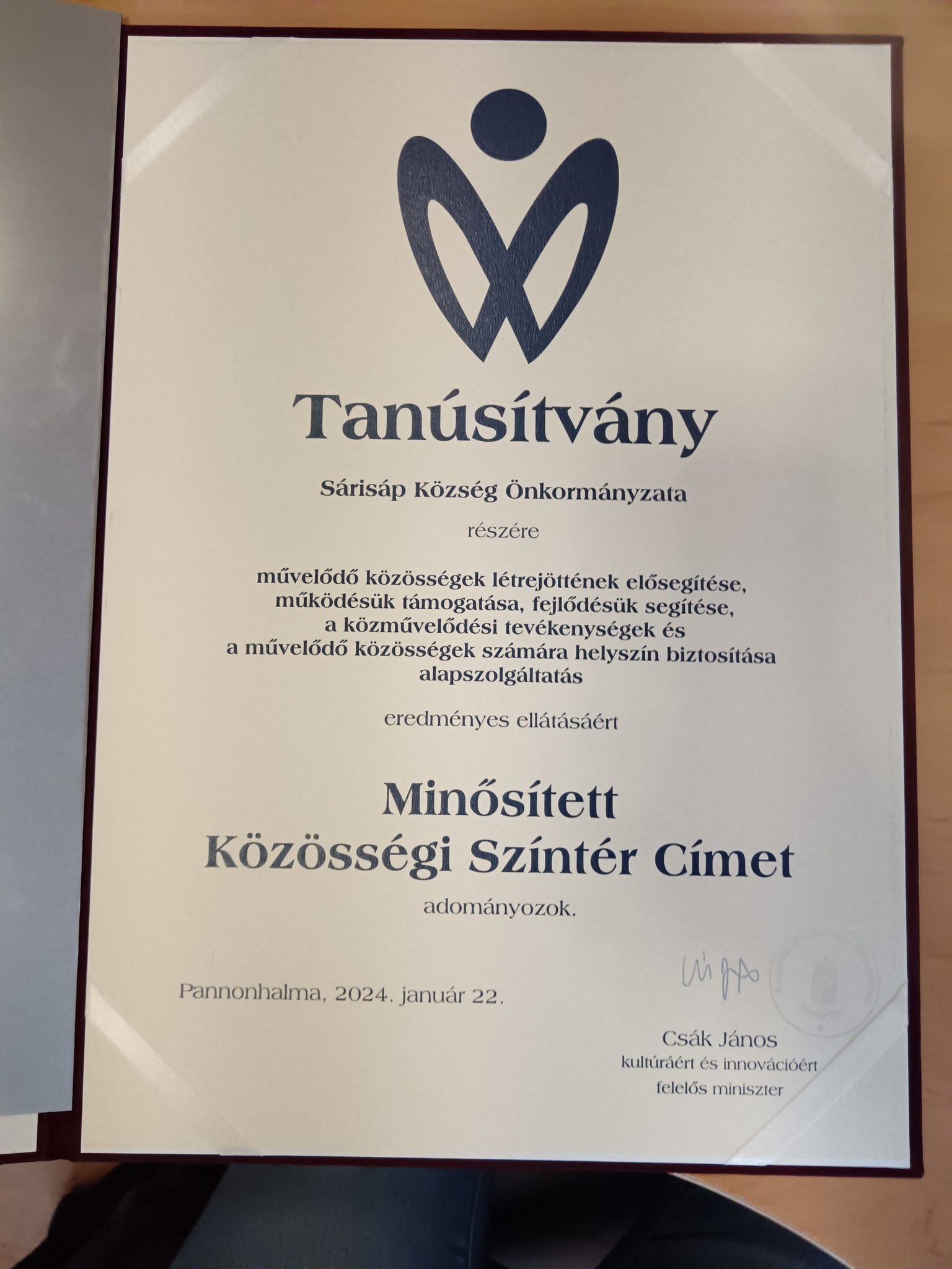Sárisáp Község Önkormányzata részére a művelődő közösségek létrejöttének elősegítése, működésük támogatása, fejlődésük segítése érdekében, a Sárisápi Bányász Közösségi Tér falai között végzett munka elismeréseként Minősített Közművelődési Színtér Címet adományozott Csák János kultúráért és innovációért felelős miniszter.