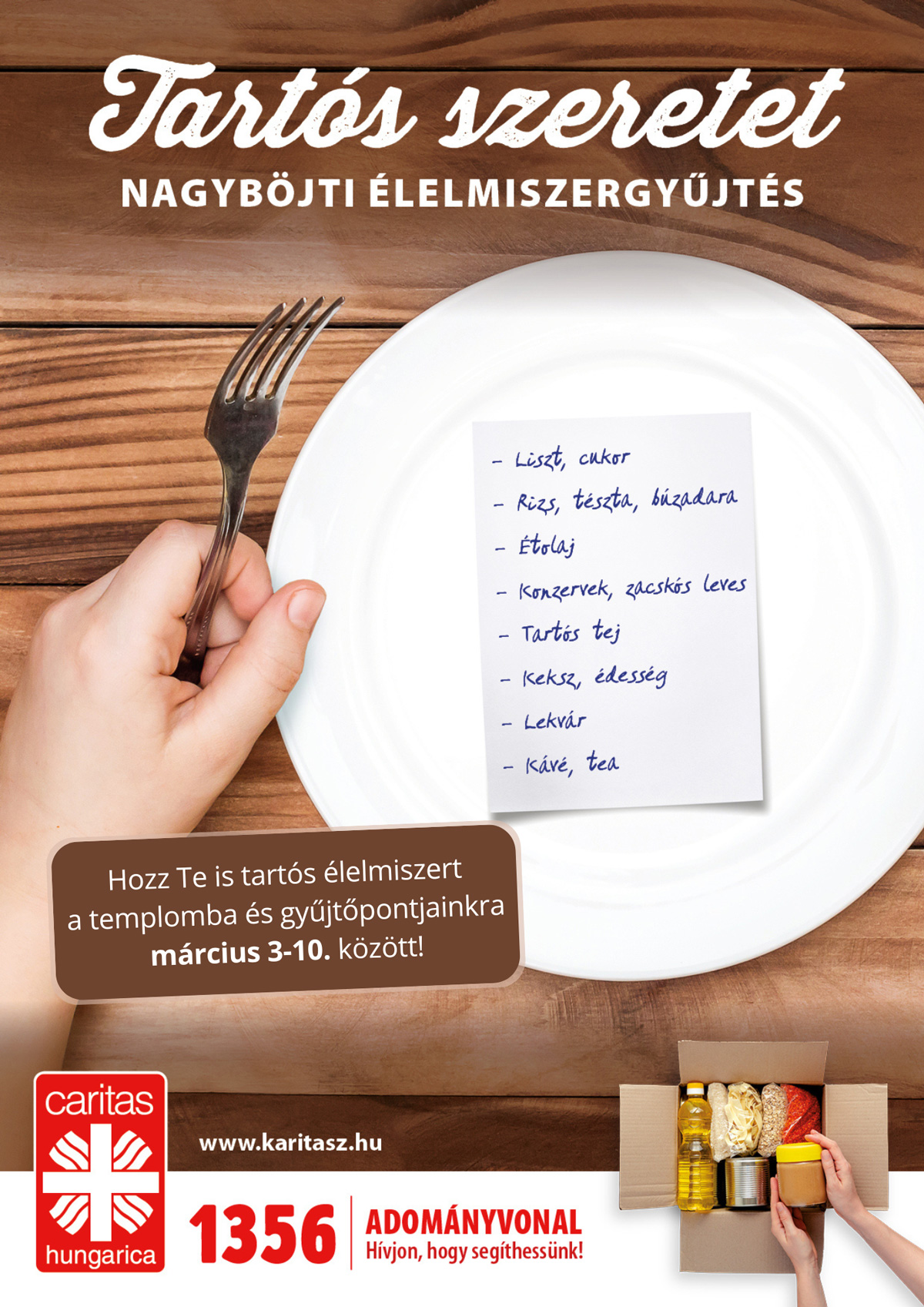 A Katolikus Karitász idén is nagyböjti tartósélelmiszer-gyűjtést rendez, mely március 3. és 10. között zajlik országszerte. Az akció célja hagyományosan az, hogy segítséget nyújtson azoknak, akik számára minden nap kihívást jelent a lakhatás, a közüzemi számlák befizetése, a fűtés, a gyógyszerek kiváltása vagy az, hogy az asztalra étel kerüljön. Nem csak karácsonykor, hanem nagyböjtben is érdemes rájuk gondolni. Húsvét előtt elsősorban tartós élelmiszereket vagy pénzadományokat várnak.
