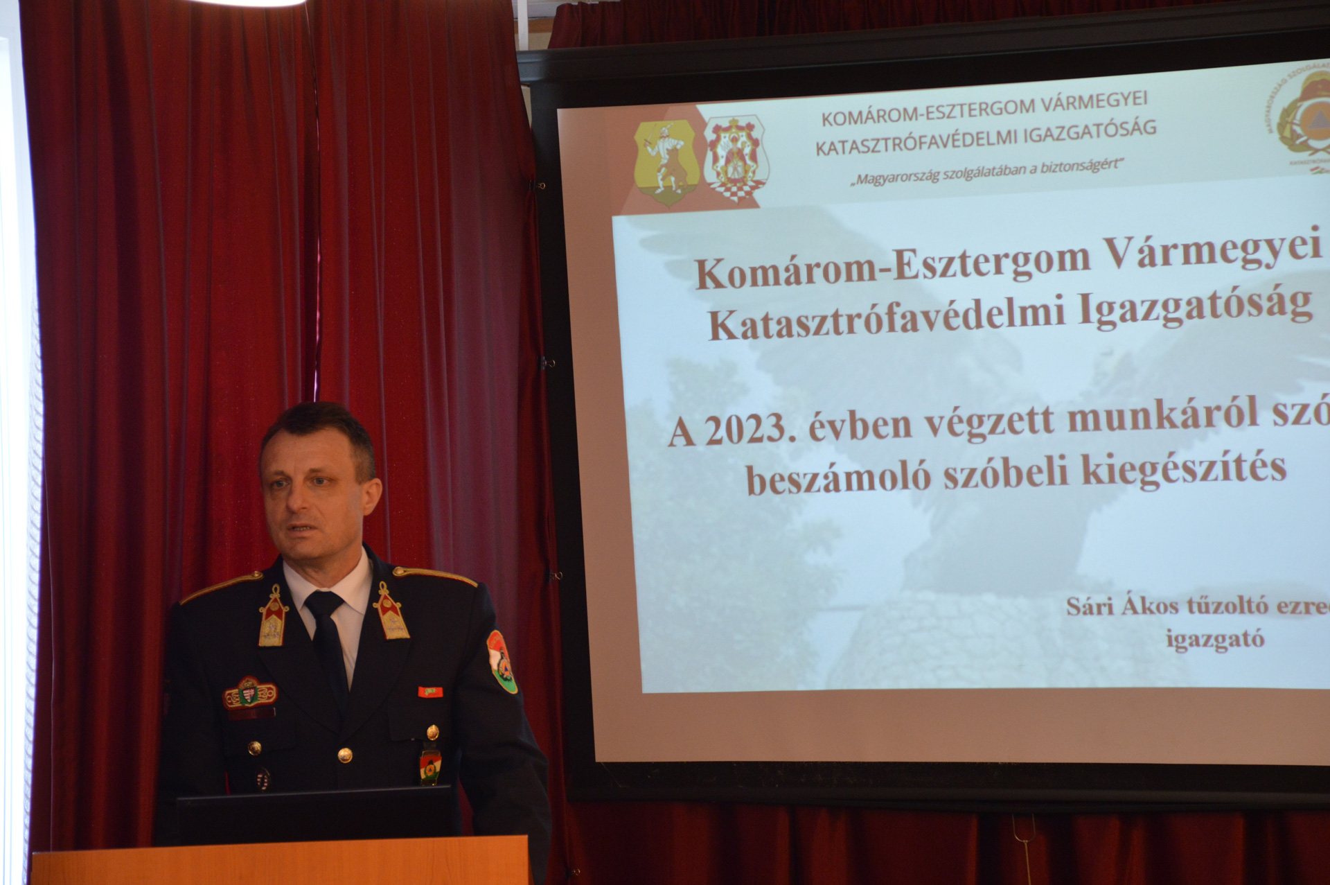 Sári Ákos tűzoltó ezredes előadásában az elmúlt év eredményeit szakterületek szintjén, statisztikai adatokat mellékelve értékelte. Előadásában a tűzoltósági, iparbiztonsági és polgári védelmi szakterületek éves adatainak értékelését követően, kitért a tűzmegelőzési munkában elért kiemelkedő eredményekre is. Az ezredes az év során pályázati úton megvalósuló fejlesztésekről és a vármegyében működő önkéntes és önkormányzati tűzoltóságokkal történő hatékony együttműködésről is beszélt. Ezt követően az előző év kiemelkedő tűzoltói beavatkozásai kapcsán köszönetét fejezte ki a beavatkozó állomány irányába, hogy mind Komárom-Esztergom, mind a vármegyehatáron kívüli segítségkérések esetén kiemelkedő szakmai színvonalon történt a káresemények felszámolása. Az igazgató hangsúlyozta, hogy a vármegyében létesülő üzemek kapcsán az iparbiztonsági és hatósági feladatok is megnövekedett számban jelentkeznek az elmúlt években, de a szakmai ismeretekkel kellőképp felvértezett hatósági állomány kellő felkészültséggel áll a helyzet elé. Az ezredes előadását követően a 2024-es évre nézve határozott meg feladatokat és irányokat vármegyei szervezet vezetői állományának.