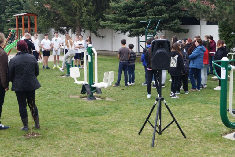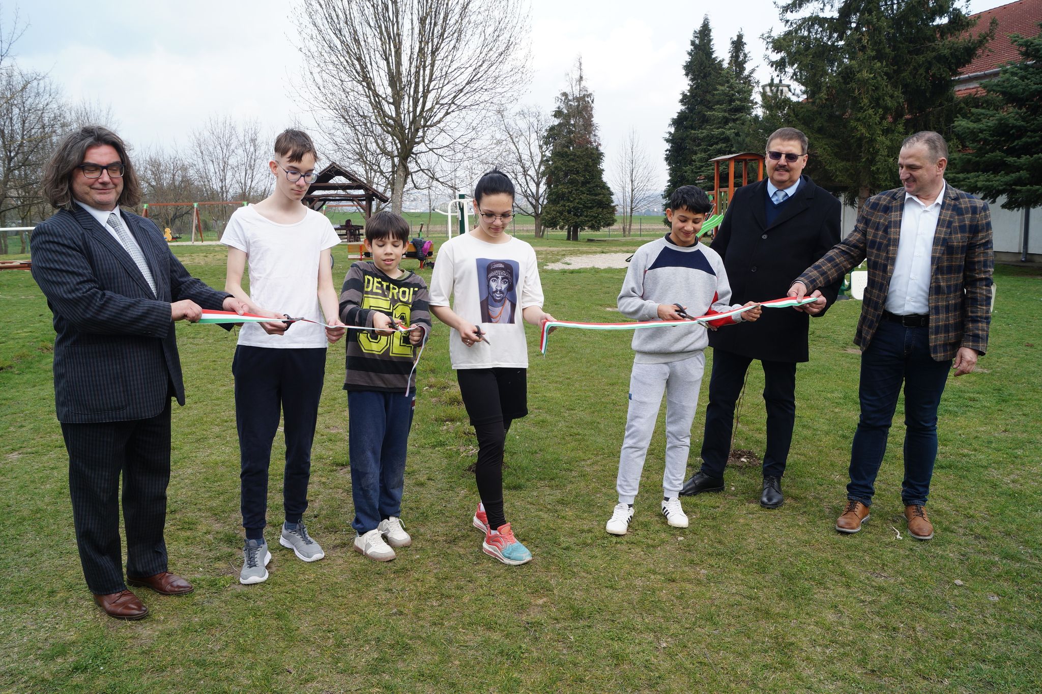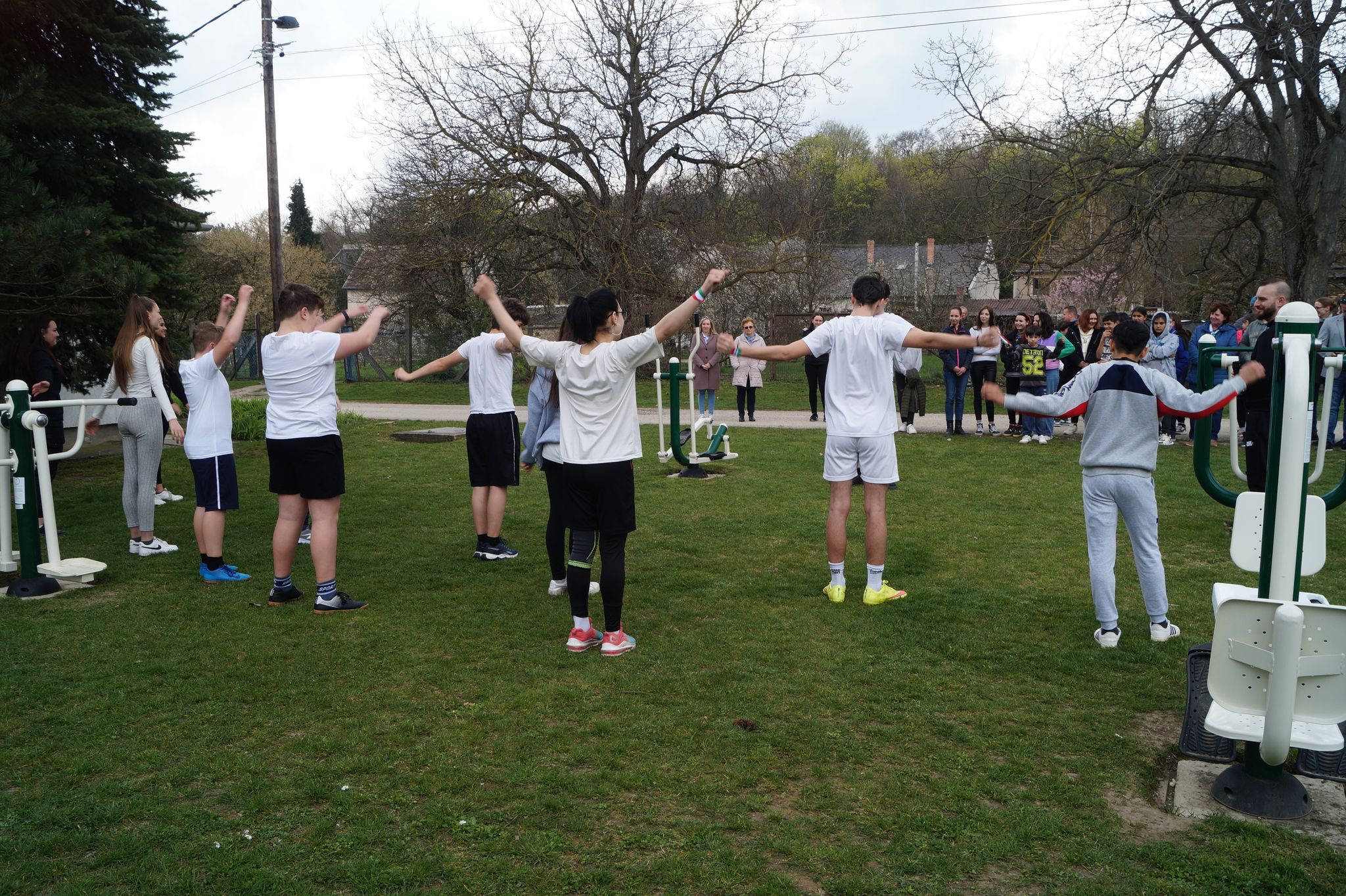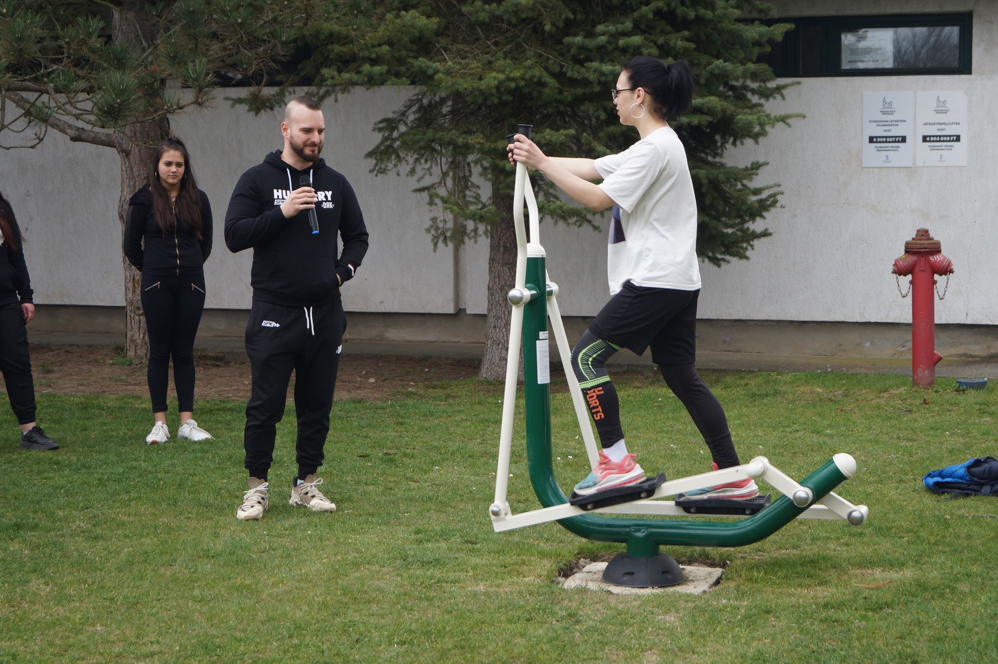 A beszédek után a diákokkal közösen vágták át a nemzeti színű szalagot, majd Kósa Ádám személyi edző az iskolások segítségével mutatta be, hogyan kell használni az eszközöket.