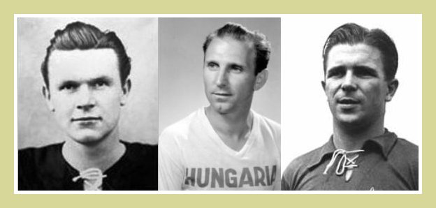 Dorogon a válogatott leggólerősebb tagjai közül balról Szusza Ferenc, Hidegkuti Nándor és Puskás Ferenc (forrás: Planet World Cup–Legends)