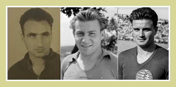 A dorogi sztárparádé kiemelkedő szereplői. Balról a dorogi kaput is védő Gellér Sándor, valamint a gólszerzők közül Budai II. László és Deák Ferenc (forrás: Planet World Cup–Legends, valamint Olympedia).