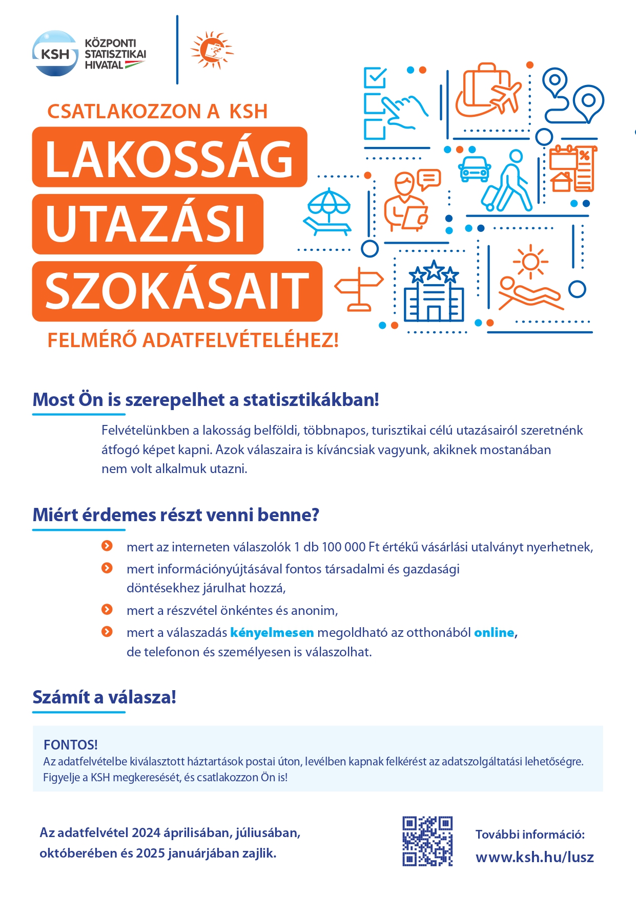 Időmérleg-felvételt indít 2024. április 8-án a Központi Statisztikai Hivatal (KSH). Az adatfelvétel az ország 264 települését érinti. A statisztikai módszerrel, véletlenszerűen kiválasztott résztvevőket postai felkérőlevélben értesíti a hivatal. A kutatásban való részvétel önkéntes és anonim. A kérdőívet kitöltők ajándékutalványt kapnak. A felmérés célja, hogy részletes, térben és időben összehasonlítható adatokat szolgáltasson a népesség időfelhasználásáról.