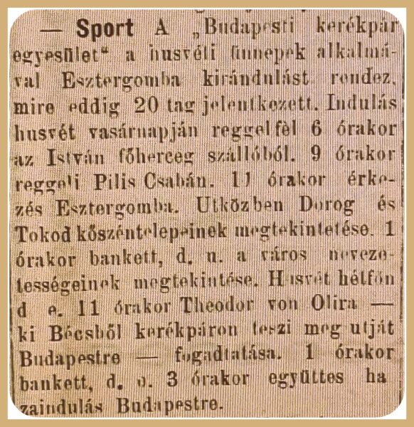 Az egyesület 1883-ban már 49 tagsági főt számlált és aktivitásukban vezető szerepet szántak a versenyeknek és a túráknak. A térségünket érintő vizitálásuk is ennek mentén bontakozott ki, amelyet a húsvéti ünnep tiszteletére időzítettek. 1884-ben a Húsvétvasárnap április 13-ra esett, s erre a napra szervezték a túrát, amelynek végcélja Esztergom lett. A részletes programban a fővárosból való kora reggeli indulást követően egy Piliscsabán beiktatott reggelizés szerepelt, majd azt követően Dorog és Tokod felkeresése, végül pedig begördülés Esztergomba. A királyi városban többek között kora délutáni bankett is szerepelt a tervekben, majd másnap, Húsvéthétfőn jeles nemzetközi bringás vendég érkezését várták. Nevezetesen, Theodor von Olira Bécsből tekert Pestre és Esztergomban csatlakozna a magyar sporttársakhoz, hogy aztán együtt tegyék meg a távot a fővárosig.