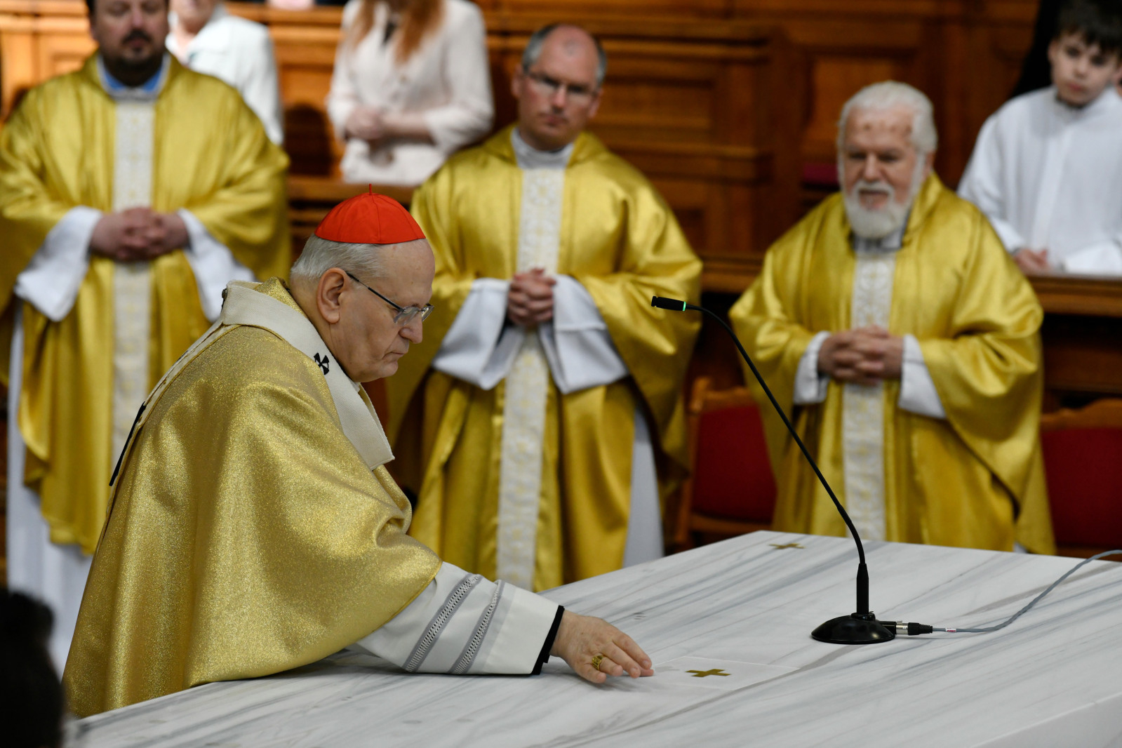 A szentelési misében a homília és a hitvallás után hangzott el a Mindenszentek litániája. Ennek végén helyezték be az ereklyéket tartalmazó oltárkövet az oltárba. A Szent Adalbert, Szent István, Boldog Gizella, Szent Imre és a kassai vértanúk csontereklyéit tartalmazó hófehér márványtömböt Ferenc pápa 2023. áprilisban áldotta meg a budapesti nunciatúra épületében.