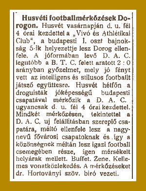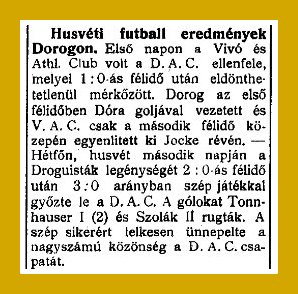 Kerek egy évszázada húsvéti focicsemegében volt része a dorogi sportbarátoknak. A Dorogi AC az ország akkori legnevesebb élvonalbeli csapatai közül a BTC és a Vívó és Atlétikai Club együtteseit, valamint feltörekvő és hamarosan profi klubbá váló Drougista IE gárdáját látta vendégül az ünnep alkalmán. A jeles eseményt a dorogiak kitűnő szereplése koronázta meg, amellyel emlékezetes, örömteli Húsvéttal ajándékozta meg híveit.