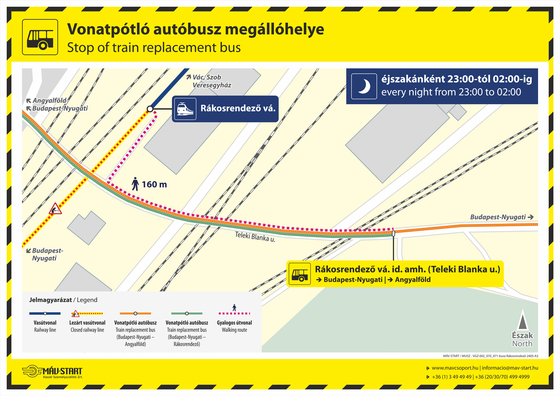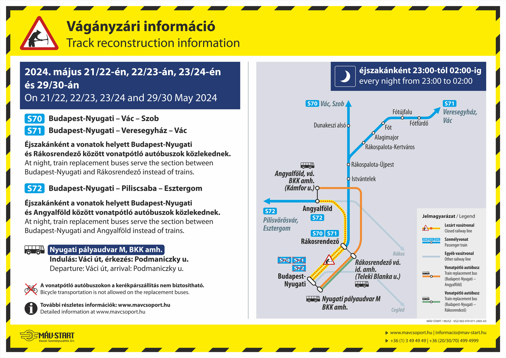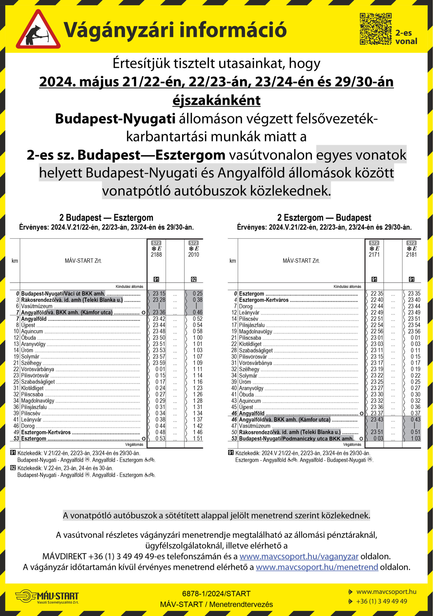 A MÁV-START Zrt. tájékoztatja a lakosságot, hogy 2024. május 21/22-én, 22/23-án, 23/24-én és 29/30-án éjszakánként Budapest-Nyugati állomáson végzett felsővezeték-karbantartási munkák miatt a 2-es számú Budapest – Esztergom vasútvonalon a hirdetményben szereplő vonatok helyett Budapest-Nyugati és Angyalföld, valamint Pilisvörösvár – Esztergom állomások között vonatpótló autóbuszok szállítják az utasokat.