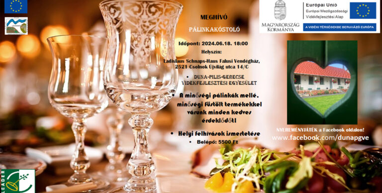 A Duna-Pilis-Gerecse Vidékfejlesztési Egyesület pálinkakóstolót szervez a csolnoki Falusi Vendégházban június 18-án, kedden 18 órakor.