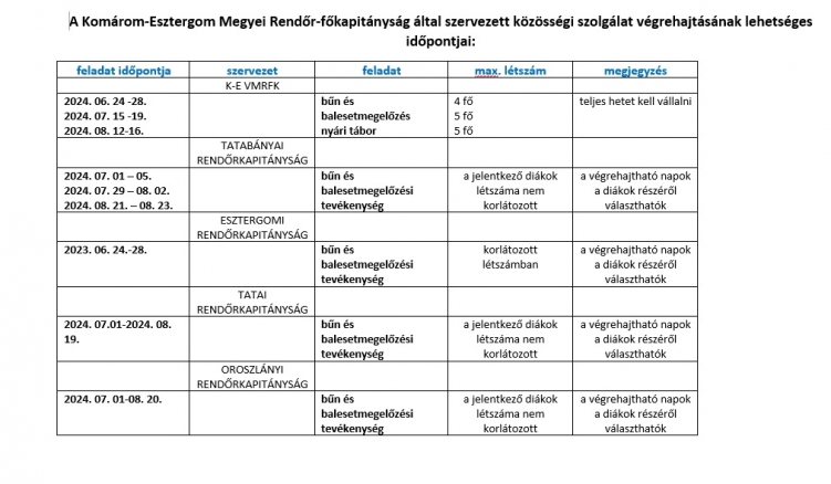 A Komárom Esztergom Vármegyei Rendőr-főkapitányság Bűnmegelőzési Alosztály munkatársai várja azoknak a diákoknak a jelentkezését, akik a rendőrségnél szeretnék eltölteni a kijelölt óraszámot. A jelentkezés feltétele, a 9. osztály befejezése, továbbá az iskolának legyen együttműködése a Komárom-Esztergom Vármegyei Rendőr-főkapitánysággal.