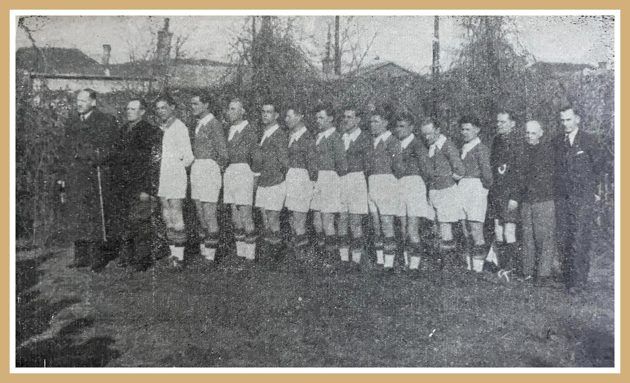 A leendő bajnokcsapat 1943-ban. Balról Gommermann Antal intéző, Nagy Sándor edző, Grosics, Bánfalvi, Bánsági, Vámos, Klausz, Bárkai, Lampert, Dunai, Antal, Farkas, Baumann, Turczer játékvezető, Sárai elnökségi tag és Mézner István vezetőedző.