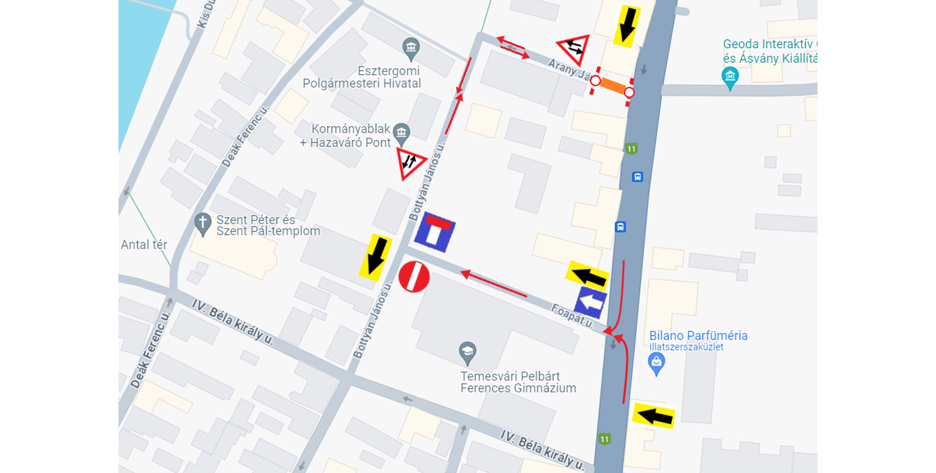 - A Postáról és az Esztergomi Közös Önkormányzati Hivatalból kihajtó gépjárművek a Jókai Mór és IV. Béla király utcákon keresztül közlekedhetnek a városközpont irányába.