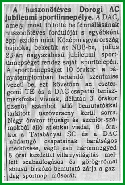 Minden sportklub és egyesület életében fontos állomások az alapítási évfordulók, amelyeket igyekeznek számontartani. A legtöbb egyesület a fertálynyi időszakos évfordulókat különös és kiemelt becsben tartja. A Dorogi AC életében 1939 hozta az első nagyobb évfordulót, s noha bizonyos fokig megemlékezés történt minden ötödik évben, a 25 éves fennállást, a negyed évszázadnyi aktív létezést megkülönböztetett figyelemmel kísérték Dorogon. Ennek megfelelően jelentős, egyben komoly ünnepséget rendeztek a klub vezetői és sportolói, amelyre nagy tisztelettel várták az addigra méltán már nagy tömegeket érintő sportbarátokat, szurkolókat. Az 1939. július 23-án szervezett központi ünnepség nyolc és fél évtizedes évfordulója alkalmából külön cikkel igyekszem emléket állítani e jelentős eseménynek (Az 5 éve megjelent cikkem frissített, bővített formája).