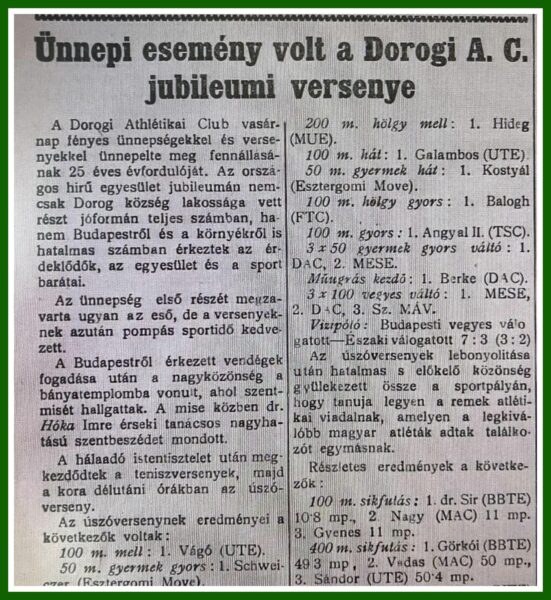 Igaz, az érdemi folytatásra már elállt az eső a délelőtt folyamán, mint az első ünnepi sportvetélkedést, a teniszversenyt zavartalanul megrendezhették, akárcsak közvetlenül utána a sportpályán rendezett szabadtéri közös ünnepi ebédet, amelyet nem csak jóízűen, de nyugodtan és főleg szárazon tudta elfogyasztani a nagyérdemű. A folytatásban zsúfolásig telt a sporttelep, miközben az úszók következtek, ahol az országos elit teljes létszámban képviseltette magát. A házigazda dorogiak szépen szerepeltek, mi több, a műugrásban hármas dorogi siker kerekedett, miután előbb mind Berke, majd Márványi, végül pedig Fiala is győzőtt. Horváth lévén további érmet is sikerült a dorogiaknak szerezniük, mégpedig az 50 méteres gyorsúszásban, ahol a dorogi úszó a harmadik lett. Ezen felül a dorogi fiatalok a 3×50 méteres gyorsváltót sikerrel nyerték és második helyet sikerült elcsípnie a dorogi csapatnak a 3×100 méteres vegyesváltóban. Az úszószámokat követően az atlétikáé lett a főszerep, ahol szintén a legkiemelkedőbb magyar egyesületek rendre megjelentek. A dorogiaknak itt is jutott siker, miután Zalatnai gerelyvetésben szerzett elsőséget, továbbá az olimpiai váltóban a dorogi csapat a harmadik helyen jeleskedett. A verseny egyik legkiemelkedőbb atlétája, Dr. Sir József, a BBTE sportolójának hamisíthatalan, remek stílusát csodálta a közönség és tapsolhatott megérdemelt győzelmének a 100 méteres síkfutásban.
