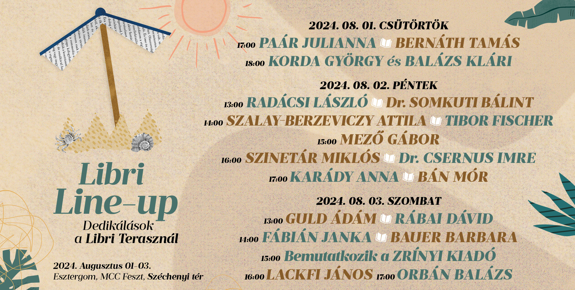 Augusztus 1-jén, csütörtökön Paár Julianna zeneterapeutával és Bernáth Tamás pénzügyi szakemberrel találkozhatnak az érdeklődők, majd este hat órától a több évtizede közönségkedvenc Korda György–Balázs Klári énekes házaspárral dedikáltathatják könyveiket a rajongók.