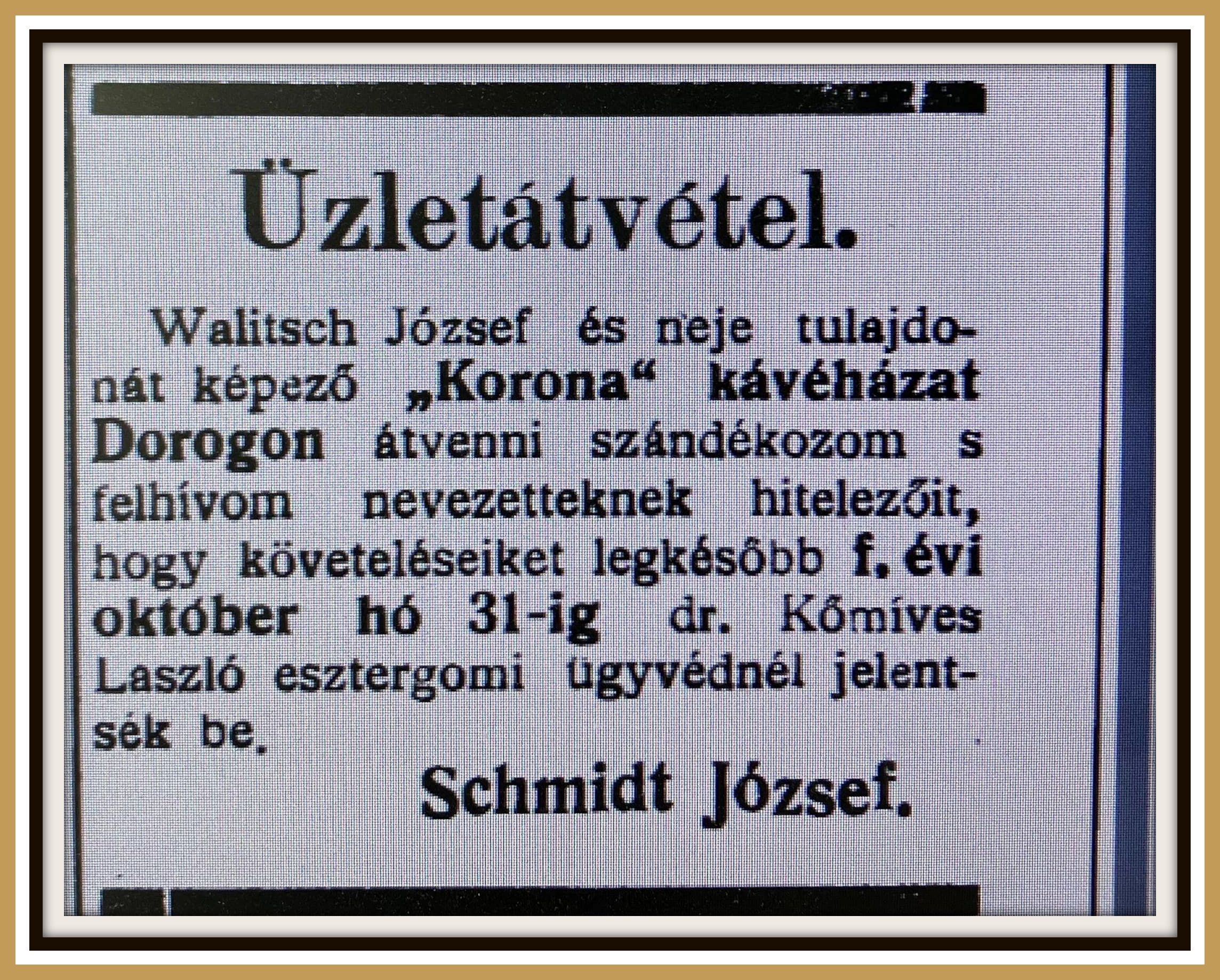 A tulajdonosváltásról szóló közlemény az Esztergom és Vidéke újság 1928. október 25.-i számában