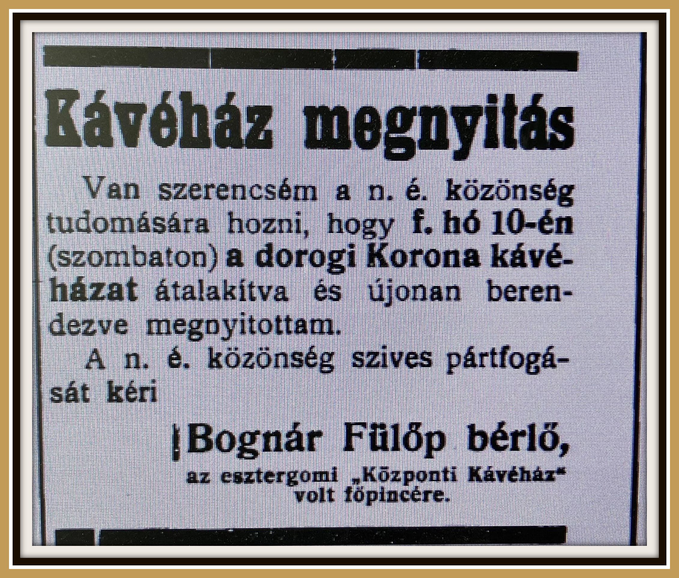 A kávéház már az új bérlő által üzemelt tovább (forrás: Esztergom és Vidéke, 1928. november 11.-i szám)