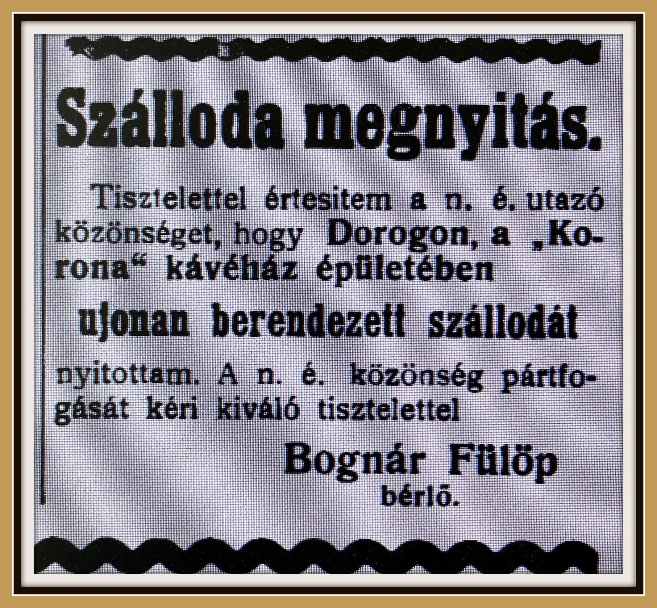 Szinte egyidőben az egykori Puchner Vendéglő megnyitásával, újabb nívós vendéglátóipari egységgel gazdagodott Dorog 1924 nyarán. Ezúttal egy elegáns és minden igényt kielégítő kávéház nyílt a település legjelentősebb forgalmi kereszteződésénél, a Bécsi út (akkoriban Petőfi út) – Esztergomi út – Kálvária út kiszögelésében, a Bécsi és Kálvária út bal oldali sarkán. Hanák Károly üzletember elhatározta, hogy az egyre városiasodó formát mutató Dorogon megnyitja újdonsült vállalkozásaként kávéházát. Hanák úr korábban az esztergomi szigeten működött Árpád-kert tulajdonosa volt. A megálmodott és sikeresen kivitelezett kávézó a Korona Kávéház nevet kapta.