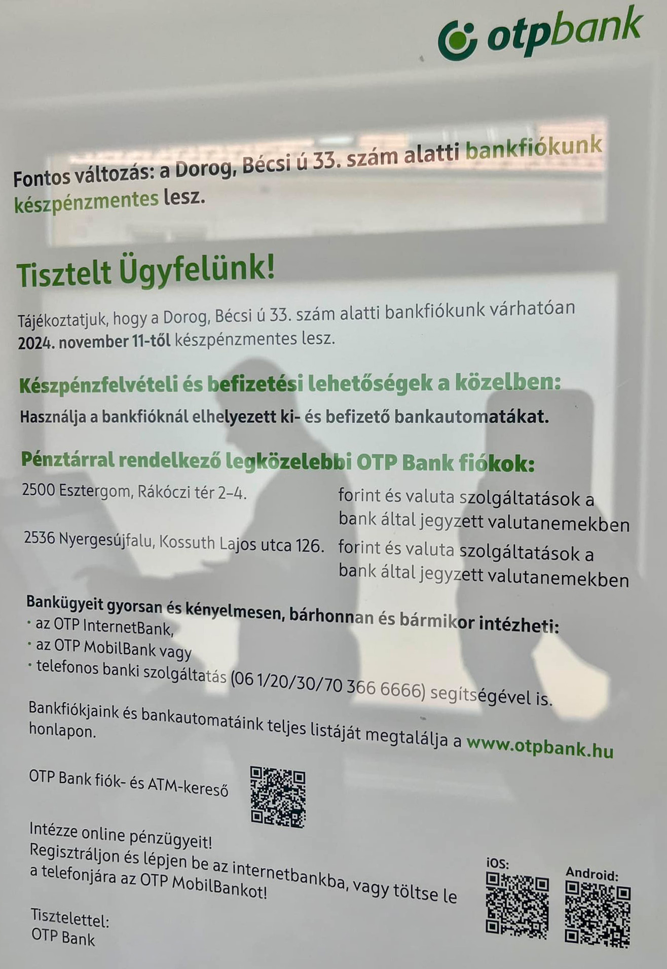Az OTP Bank Nyrt. tájékoztatja ügyfeleit, hogy a Dorog, Bécsi út 33. szám alatti bankfiók várhatóan 2024. november 11-től készpénzmentes lesz.