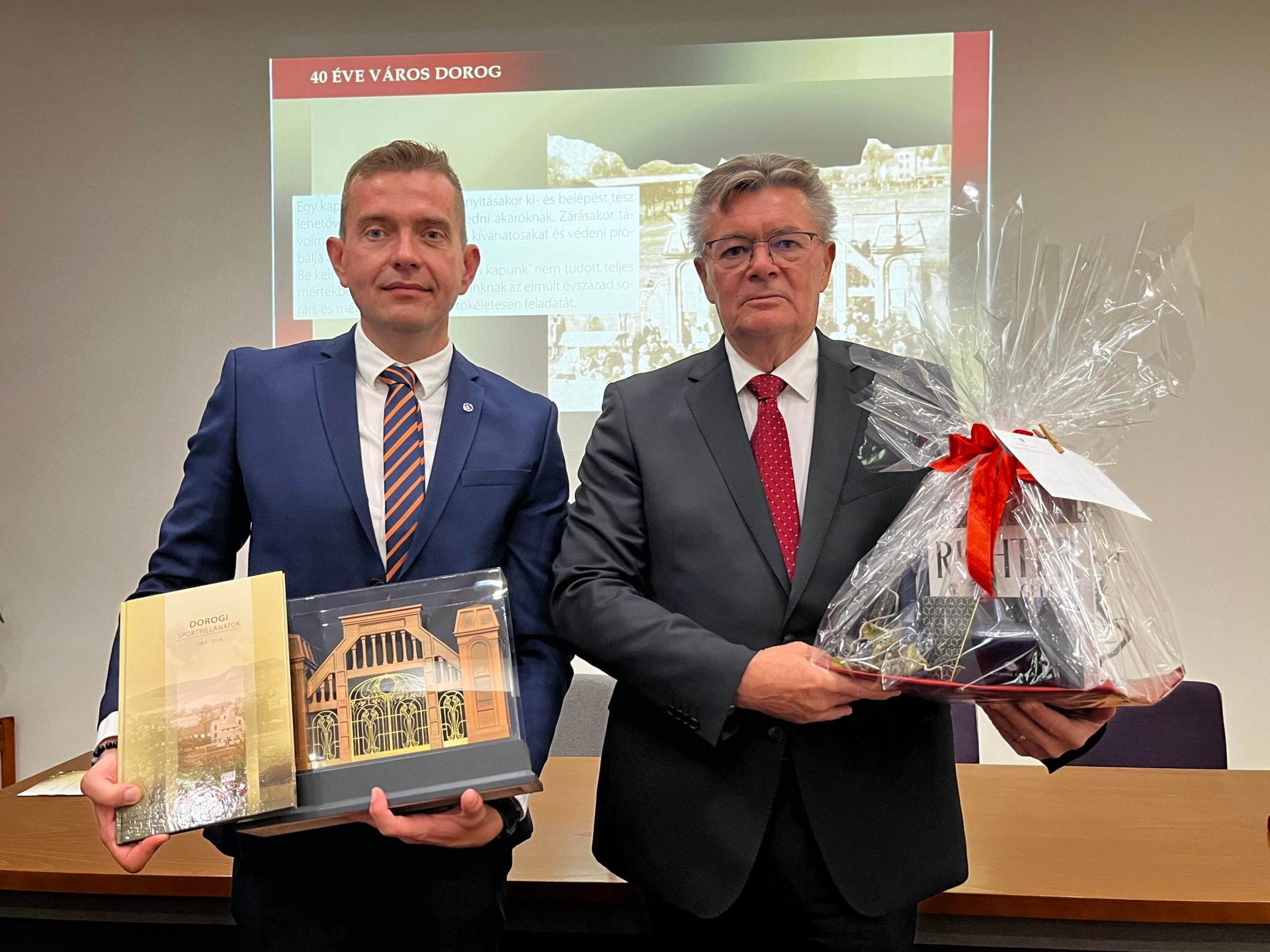 Garai Zoltán, a Richter Gedeon Zrt. dorogi fióktelepének vezetője felidézte a gyár sportegyesületének, a Fabulon SC-nek a történetét, majd megemlékezett arról, hogy idén nem csak azt ünnepeljük, hogy 40 éve lett város Dorog és 110 éves a dorogi sportélet, de azt is, hogy 30 éve vezeti városunkat Dr. Tittmann János polgármester, akinek a Richter nevében, elismerésük jeleként ajándékot nyújtott át.