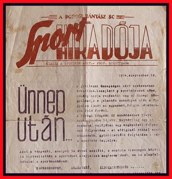A Dorogi Bányász Sport Híradójának külön kiadásának címlapja közvetlenül a központi ünnepségsorozatot követően