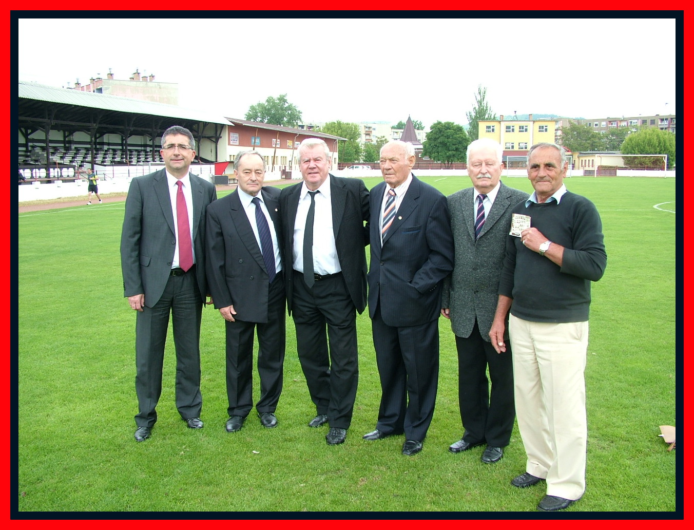 Mayer László klubelnök (balról) a kiemelt díszvendégek – Bartalos József, Szűcs Lajos, Buzánszky Jenő, Horváth Péter és Karába János – társaságában a stadion gyepszőnyegén