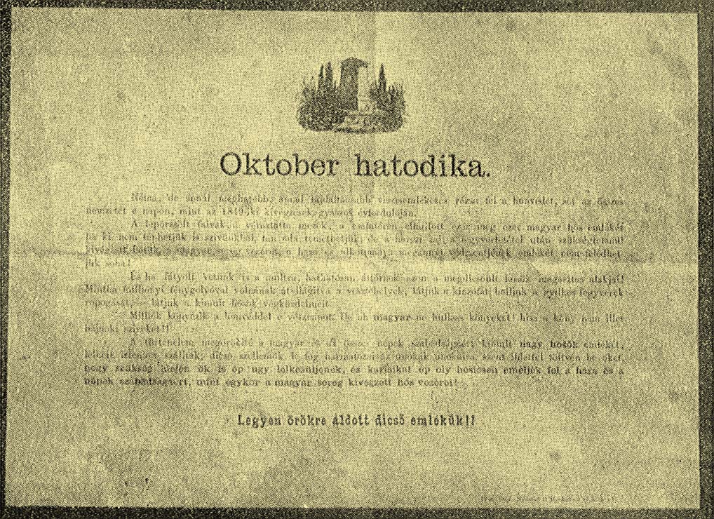 Az 1848–49-es magyar szabadságharcot az orosz cári csapatok elképesztő túlereje által leverték, amely a Világosi fegyverletétellel ért véget. Ezt követően a hadifoglyokat átadták a bécsi udvarnak, amely a nem sokkal korábban választott új császár, Ferenc József jóváhagyásával kegyetlen megtorlással állt bosszút a függetlenségéért harcoló Magyarország politikai és katonai vezetőin, de a polgári lakosságot sem kímélte. Ennek kiemelt részeként, Aradon tizenhárom honvédtábornokot, Pesten pedig a szabadságharc miniszterelnökét 1849. október 6-án kivégezték. Emlékcikkünk egyben a szabadságharc valamennyi áldozata előtt is tiszteleg.