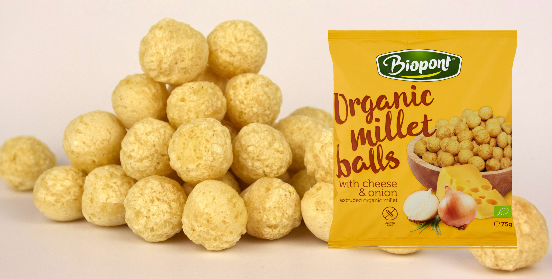 Termék neve: Extrudált BIO kölesgolyó, sajtos-hagymás ízesítésű 75 g