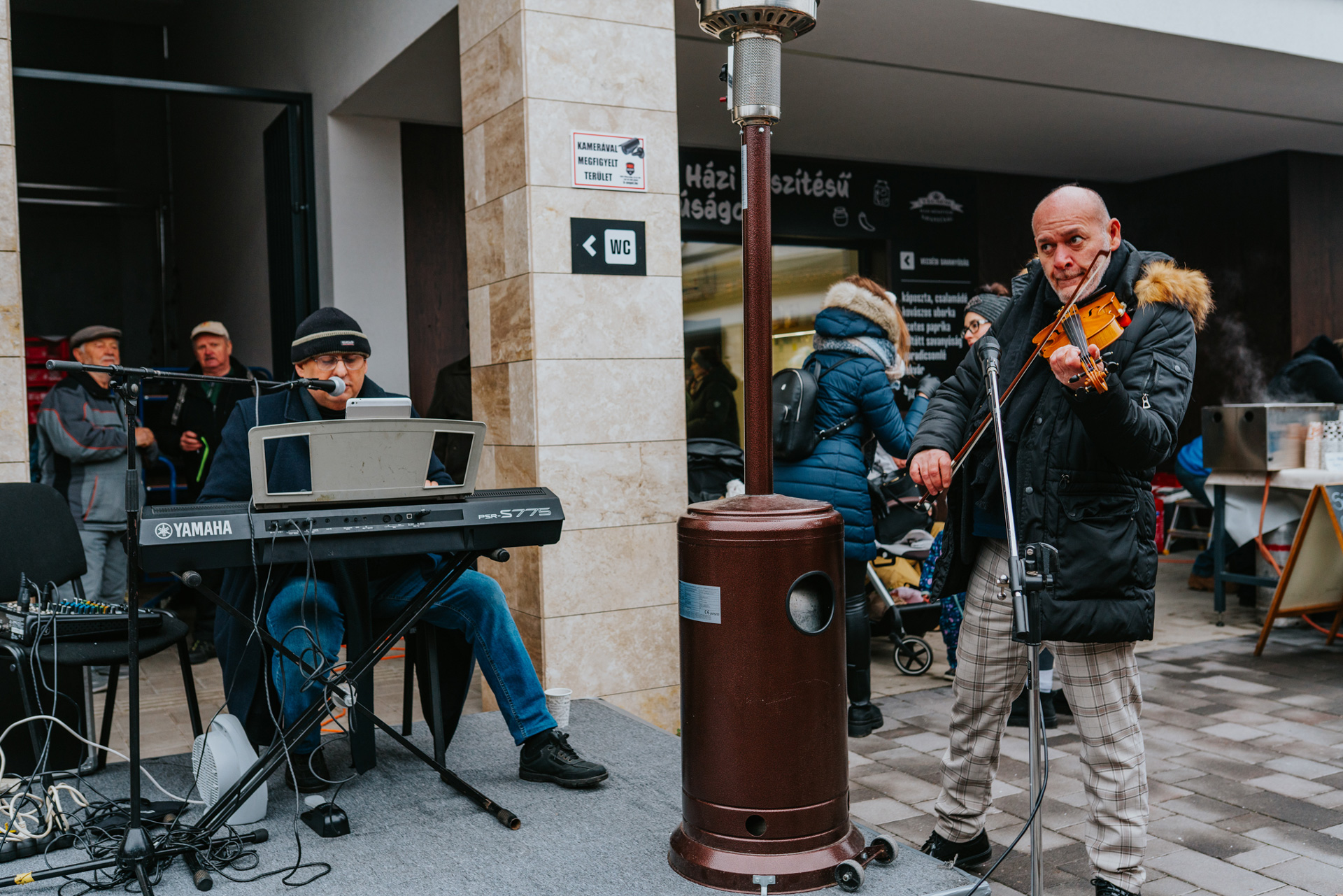 Na de végül is a malacságok miatt jöttünk a piacra, ezért társammal be is álltunk Patkó Gergőék sorába, ahol szmókerben sütötték a finomságokat. Miközben vártuk az ételünket egy kvízjátékra lettünk figyelmesek. Azok, akik jártasak voltak a disznóvágás fortélyaiban, a helyesen megválaszolt kérdéseket értékes ajándékokra válthatták be. Miközben mindenhol finom sült illatok keringtek, a hangszórókból jó magyar muzsika szólt, melyet a Janoska Band szolgáltatott.