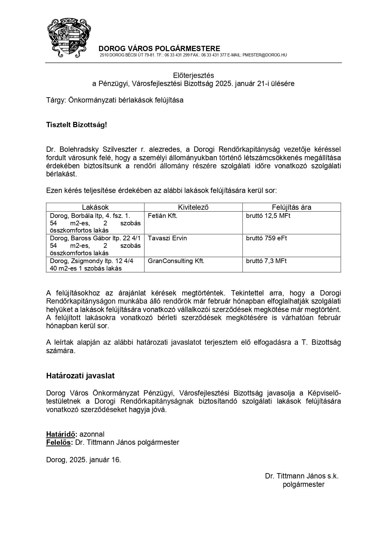 A Pénzügyi és Városfejlesztési Bizottság 2025. január 21-i ülésén tárgyalta dr. Tittmann János polgármester önkormányzati bérlakás fejlesztésről szóló előterjesztését – közölte Dorog Város Önkormányzata a hivatalos honlapján.
