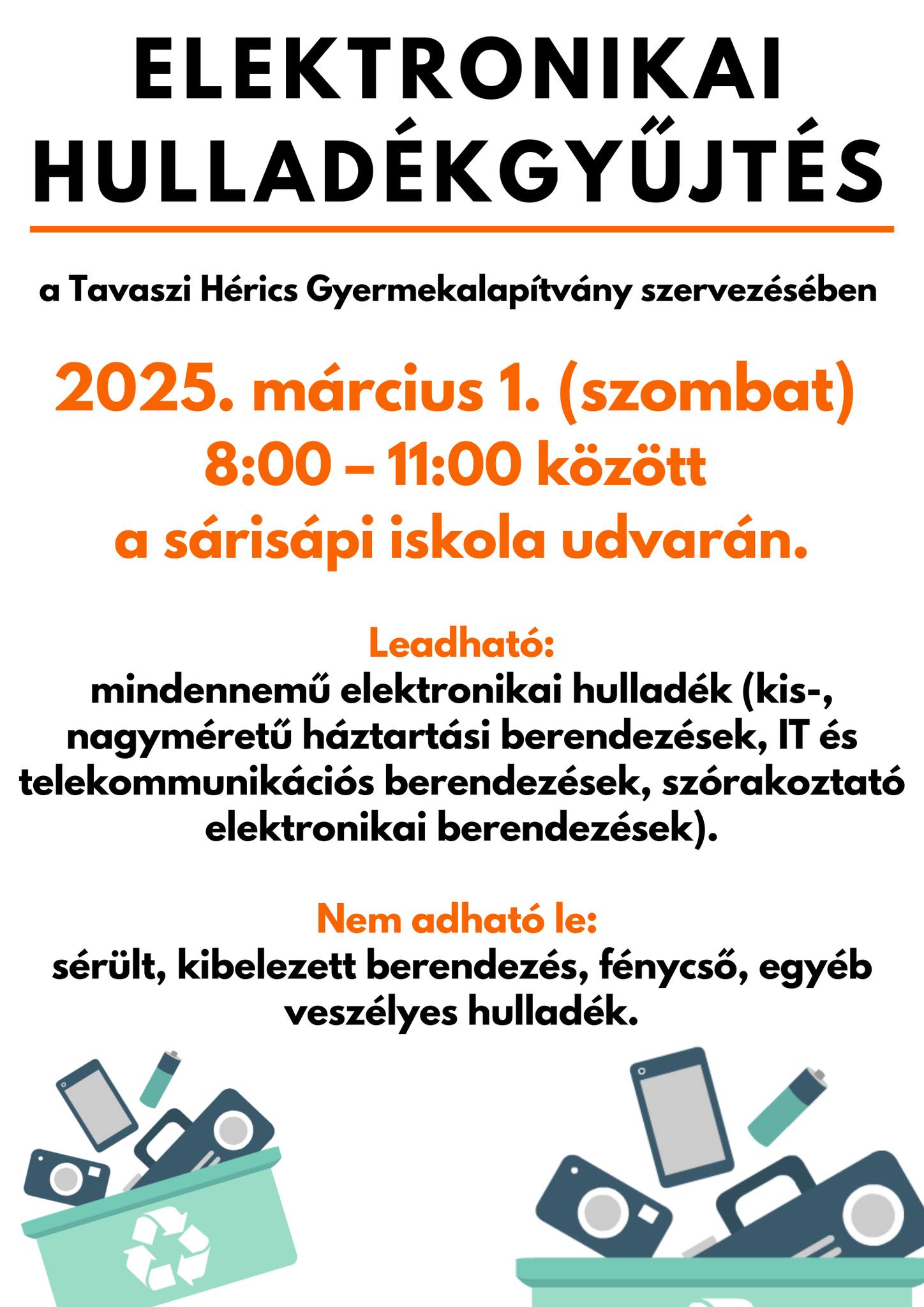 Március 1-jén, szombaton 8 és 11 óra között a Tavaszi Hérics Gyermekalapítvány szervezésében elektronikai hulladékgyűjtést szerveznek a sárisápi iskola udvarán.