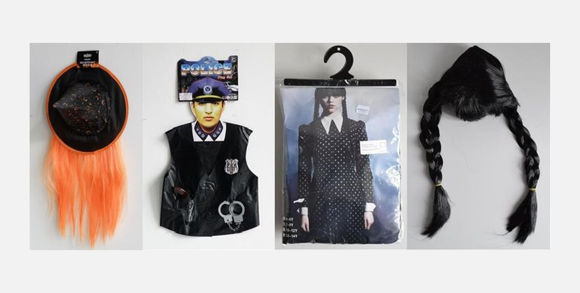 Az álarcok, parókák, kiegészítők általában egy méretben kaphatók. Azokat a jelmezeket, amelyet kifejezetten gyerekeknek terveztek, címkével jelölik és a gyermek magasságát, életkorát is feltüntetik, ami megtalálható a termékleírásban.
