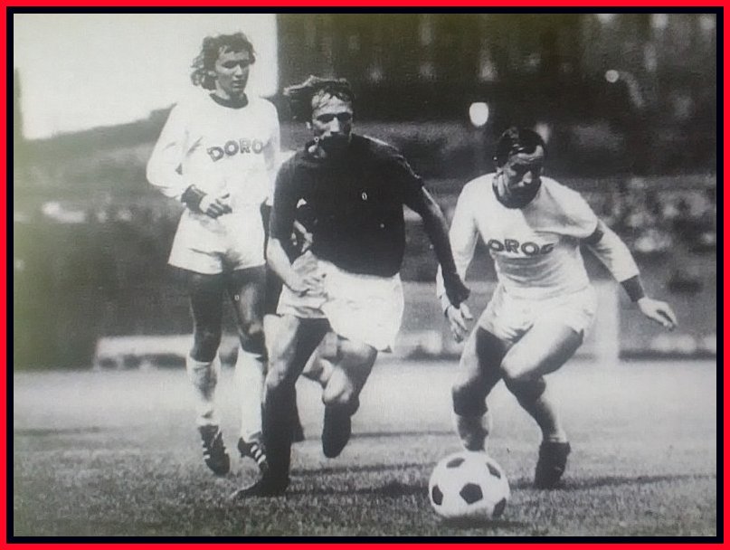 Fazekas László tör előre Major Ferenc és Tóth Gyula között Újpesten, az 1976-ban játszott bajnokin (forrás: Képes Sport újság)