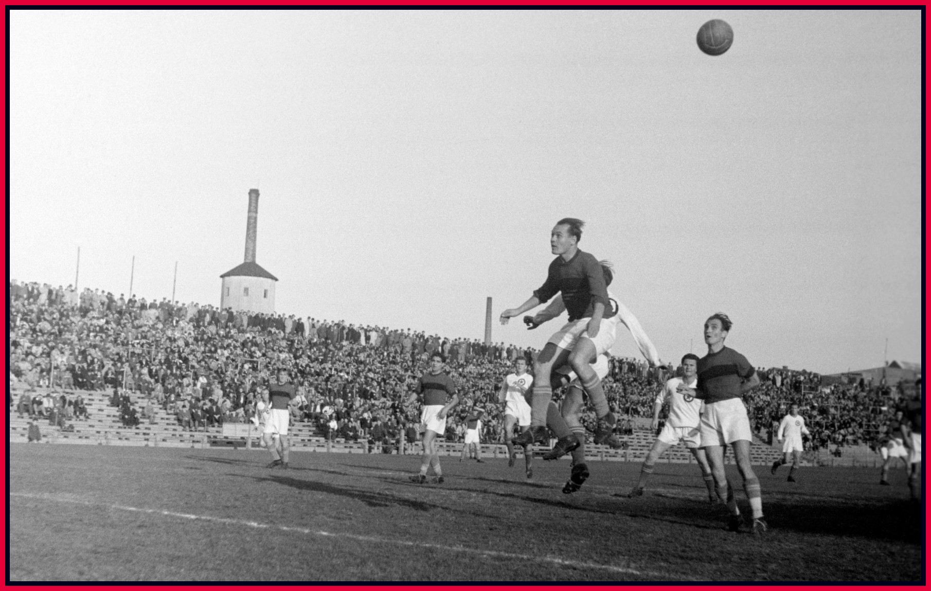 A legelső egymás elleni bajnokik egyike, amikor a dorogiak 3–3-as döntetlennel zártak a Megyeri úton 1950 őszén. A képen éppen Buzánszky veri vissza a hazaiak támadását. Mögötte jobbról játékostársai – jobbról Hargitai, balról pedig Pfluger és Bakonyi – biztosítanak (forrás: MTI Nemzeti Fotótár, Hiradó.hu).