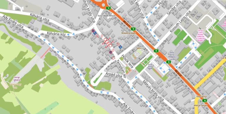 - A Kálvária utca felőli oldalon letakarásra kerül az útkereszteződésben a „kötelező haladási irány jobbra-balra tábla (Bécsi út felől közlekedők táblája), jobbra és balra kanyarodni tilos tábla, behajtani tilos tábla.