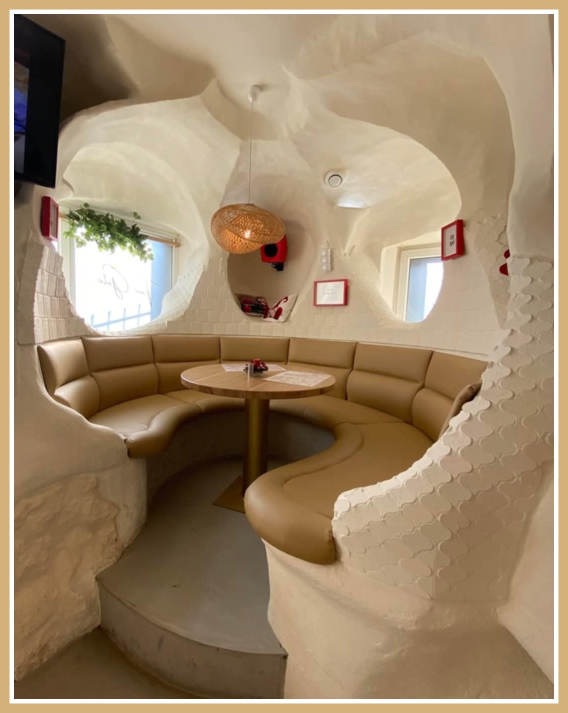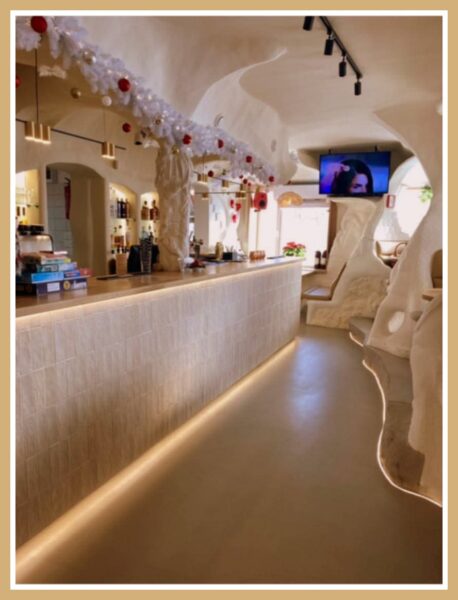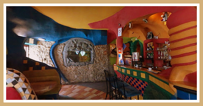 A belső tér kialakítását az igen sokoldalú, tehetséges és kreatív fiatalember, az ugyancsak dorogi Imre Tibor végezte. Alapötletként a nemzetközileg is elismert spanyolországi katalán származású Antoni Gaudí építész jellegzetes stílusa szolgált. A mester névjegyévé vált organikus építészeti alkotásai jellemzően Barcelonában csodálhatók meg. Ennek az érdekes és változatos építészeti formának stílusjegyei köszönnek vissza a kávézó arculatán. A belső tér egyedi vonalvezetésű formáinak és idomainak külső burkolását, díszítését színes zománccserepek és csempe mozaikok fedik, míg az asztallapok és a pult felülete tömény, masszív fa. Ezen felül számos kerámia díszítőelem is be lett építve a színes burkolatba. Az összhatás egy futurisztikus érzetet kölcsönöz, amely a kávézó nevével harmonizálva, valóban olyan, mintha átlépnék egy időkapun.