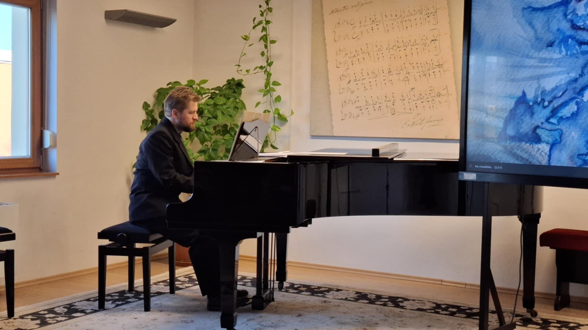 Kálvin Balázs zongoraművész az Alkotó Muzsikusok Társasága egyik újabb tagja úgy adta elő három tételes zongoraciklusát, a „Jelenetek a természetből” címűt – 1. Villámcsapás 2. Végtelen hómezők 3. Farmon –, hogy közben megtekinthette a közönség a mű ihlette gyermekrajzokat.
