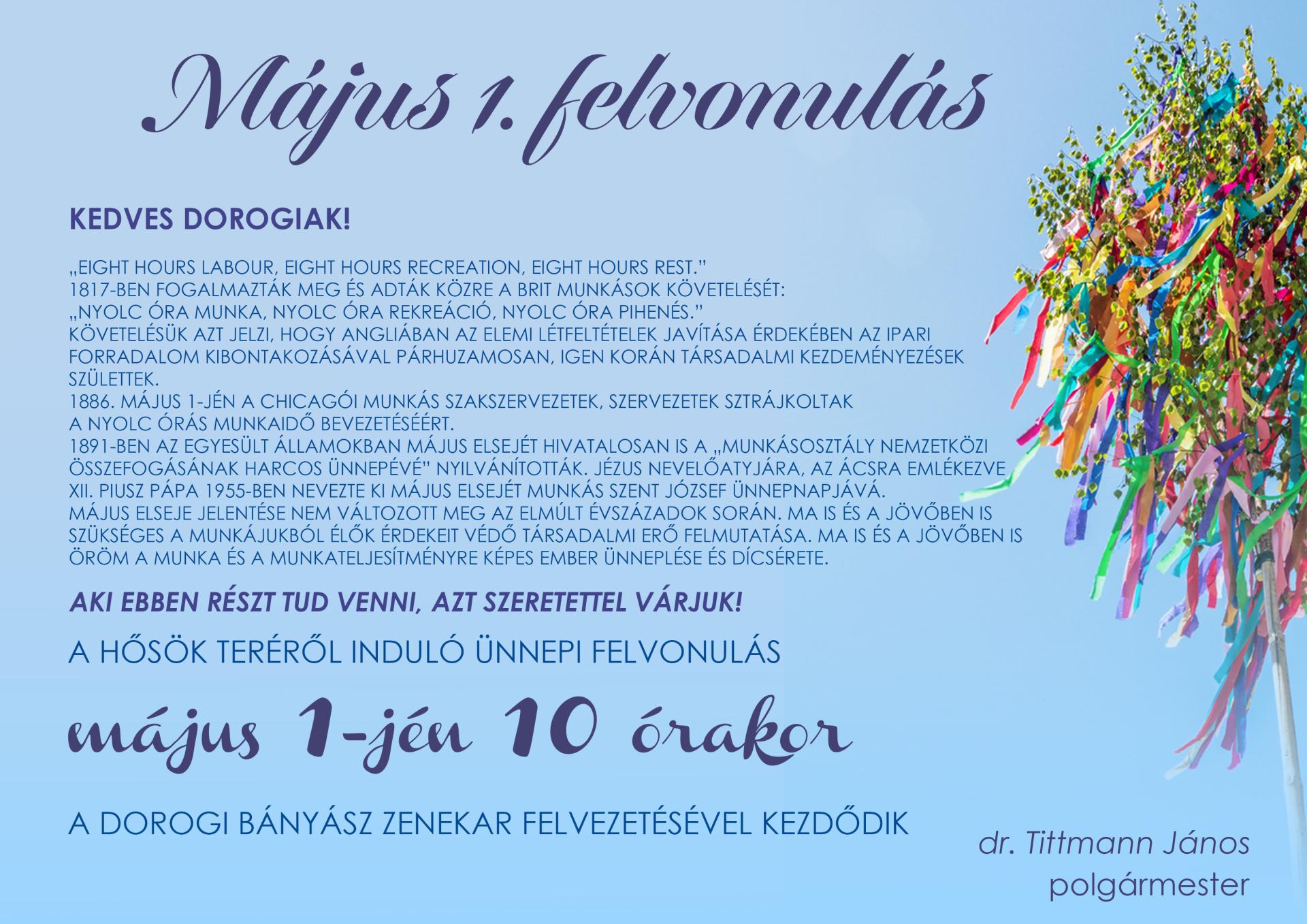 Az önkormányzat felhívja a figyelmet, hogy a felvonulás miatt ideiglenes forgalomkorlátozásra számíthatnak az autósok május 1-jén 10-11 óra között Dorogon a Bécsi út Hősök terétől-Mária utcáig tartó szakaszán, a Mária utcában és a Köztársaság úton az Otthon térig. Az útszakaszokat a Dorogi Rendőrkapitányság és a polgárőrség biztosítja.