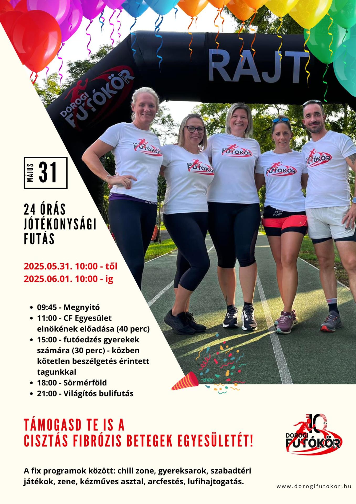A 10. születésnapját ünneplő Dorogi Futókör Sportegyesület idén is megrendezi immár hagyományosnak számító 24 Órás Jótékonysági Futását, amelynek idei évi kedvezményezettje a Cisztás Fibrózis Magyarország – Association of Cystic Fibrosis Patients.