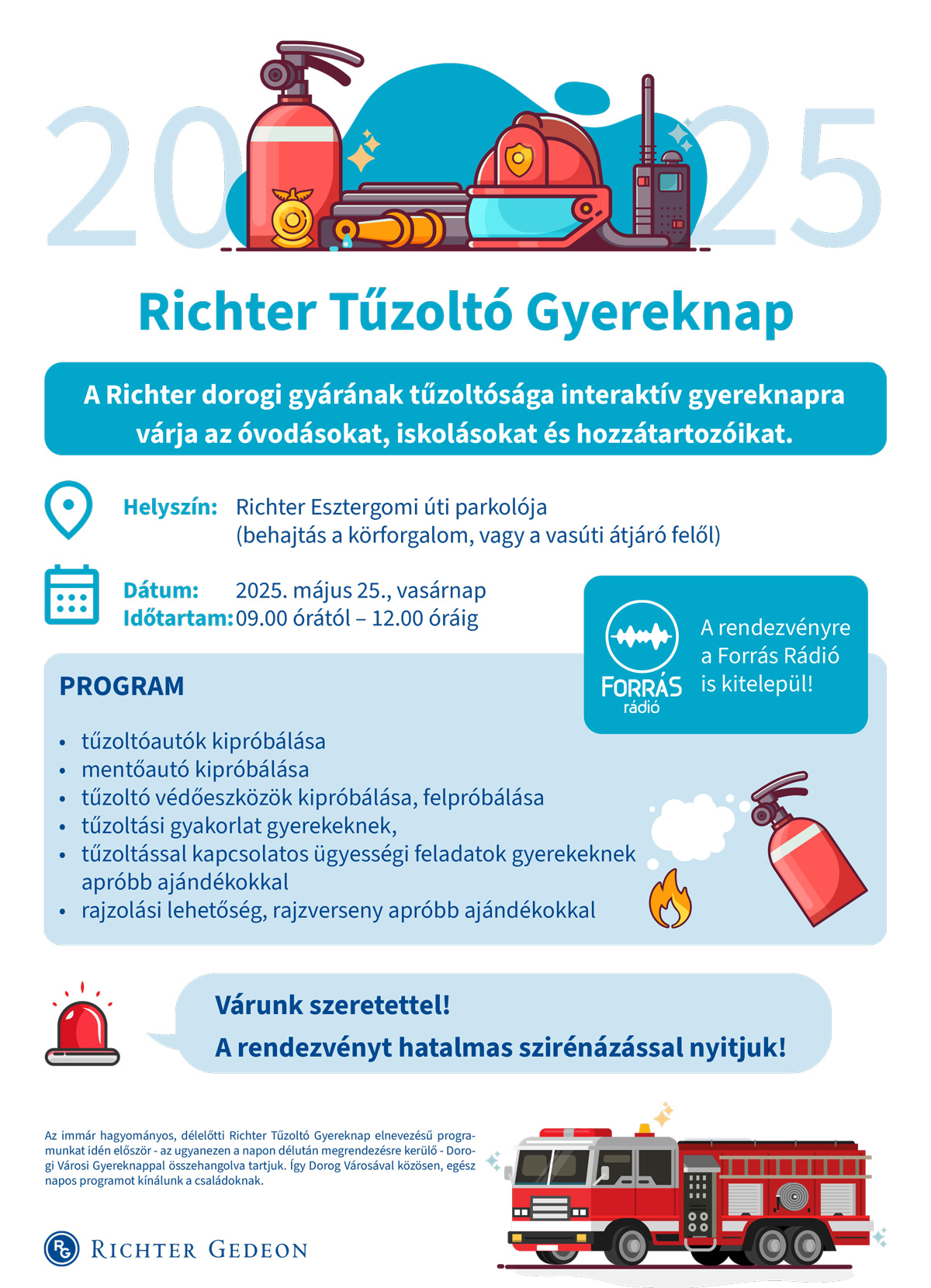 Ha Ön és gyermeke kíváncsi a tűzoltók munkájára, ha szeretnék közelebbről is megnézni a dorogi gyáregységnél található tűzoltóautókat, felszereléseket, akkor látogassanak ki a Richter Tűzoltó Gyereknapra!