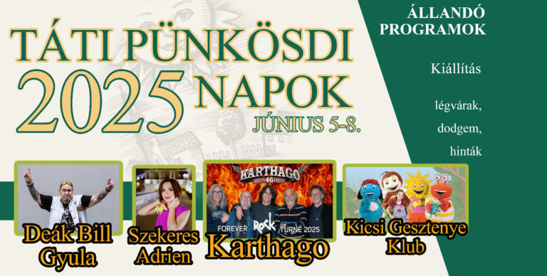 Június 5. és 8. között rendezik meg a Táti Pünkösdi Napokat. Az eseményen többek között fellép Szekeres Adrien, Deák Bill Gyula és a Karthago.