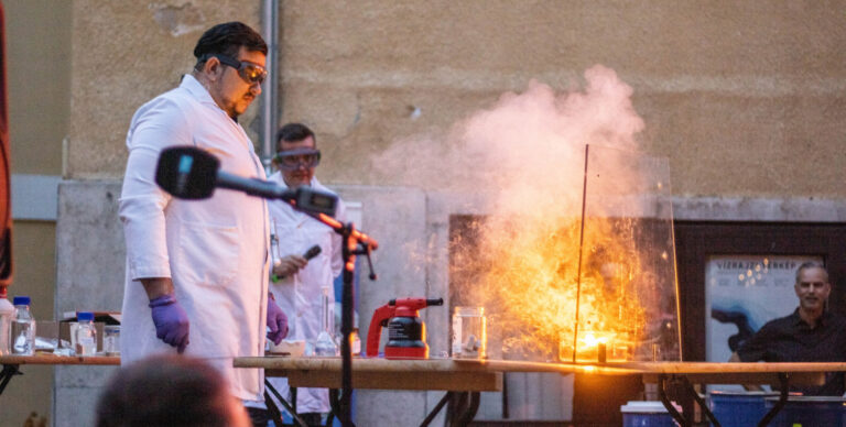 Kétségtelenül az este egyik leglátványosabb és legnépszerűbb eseménye a Richter Tudományos Show volt, amely szinte laboratóriummá varázsolta a Duna Múzeum udvarát. Az érdeklődők tűkön ülve figyelték, ahogy a sötétben neonfények, robbanások és füstfelhők festették meg a tudomány világát. A show nemcsak látványos volt, hanem edukatív is – Pilling Dávid, a Richter dorogi gyáregységének üzemvezetője könnyed humorral és érthető magyarázatokkal hozta közel a kémiát kicsikhez és nagyokhoz egyaránt. „Ez volt a legmenőbb dolog, amit valaha láttam egy múzeumban!” – mondta egy tizenéves fiú, aki barátaival együtt a show minden percét videóra vette.