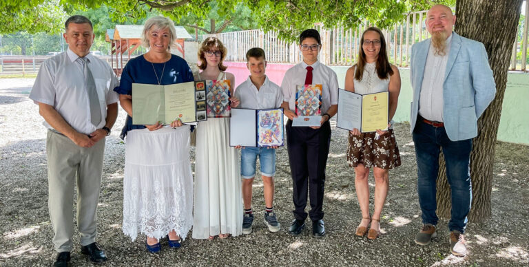 A képen balról jobbra: Jászberényi Károly iskolaigazgató, Bogár-Bódi Bernadett, Varga Lili, Péceli Dávid, Jánosi Benedek, Málnai Krisztina és Muszela Szabolcs a tankerület igazgatója látható.