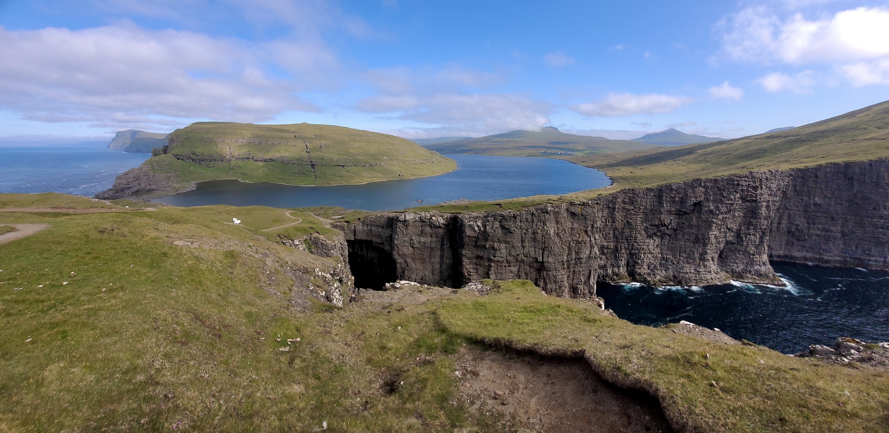 A fővárostól a reptéri kitérőt is beleszámítva majd egy órányit autóztunk, ami nagyjából 42 kilométernek felelt meg, mire Miðvágur településtől 1,2 kilométerre nyugatra letehettük a kocsikat. Innen indul az a körülbelül 1 órás séta, ami az óceánpartra, a híres-hírhedt Trælanípa szirtre visz. A gyalogút valóban séta, túrának túlzás is lenne nevezni, legfeljebb az utolsó néhány száz méternyi kapaszkodót hívhatnánk annak. Maga a tó – amely egyébként Feröer legnagyobbika – 3,4 négyzetkilométeren terül el, hossza 6, szélessége 0,8 kilométer, átlagos mélysége 27,5, legnagyobb mélysége pedig 59 méter.