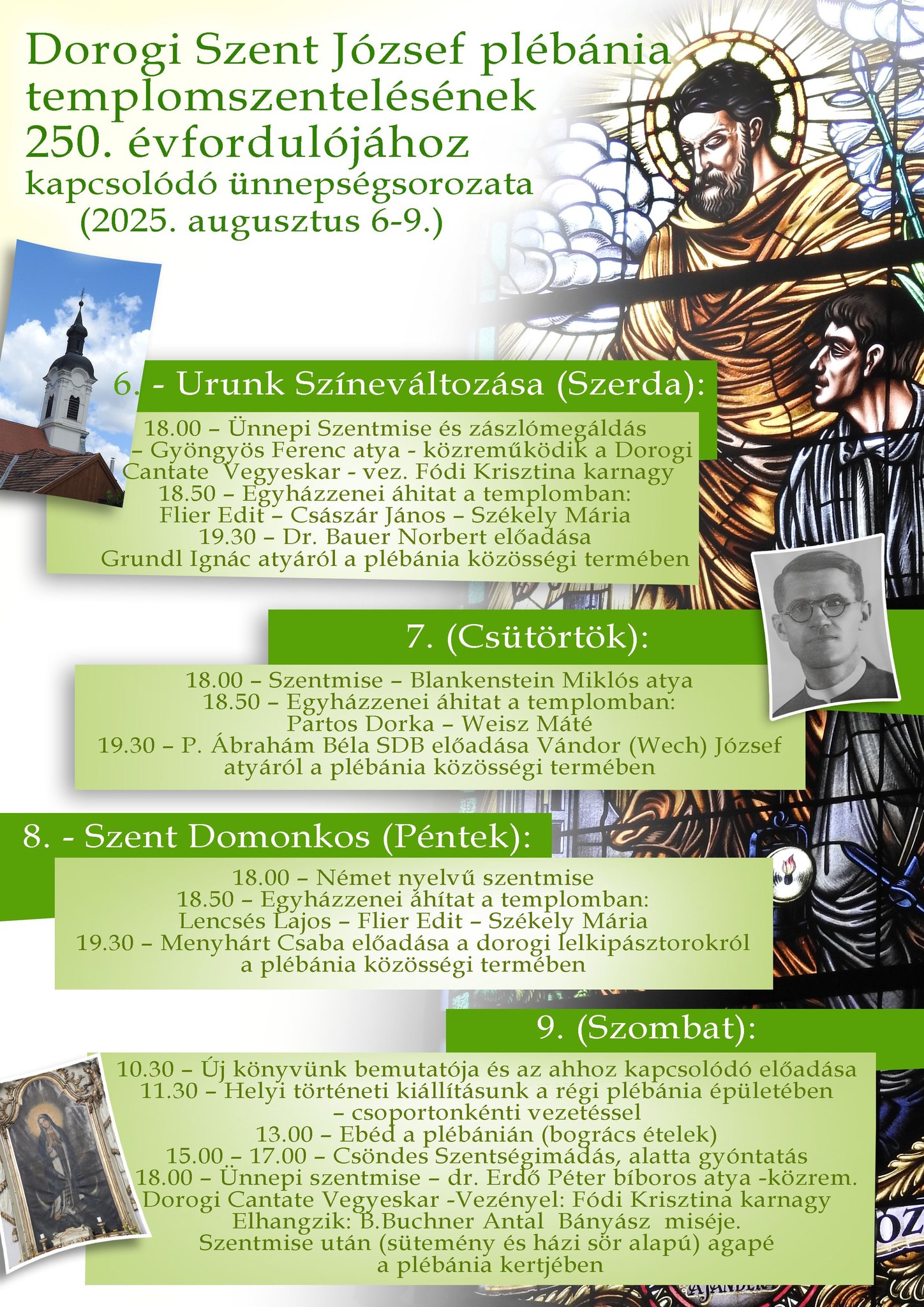 A Dorogi Szent József plébánia templomszentelésének 250. évfordulójához kapcsoló ünnepségsorozatot 2025. augusztus 6. és 9. között rendezik meg. Mutatjuk a részletes programot!