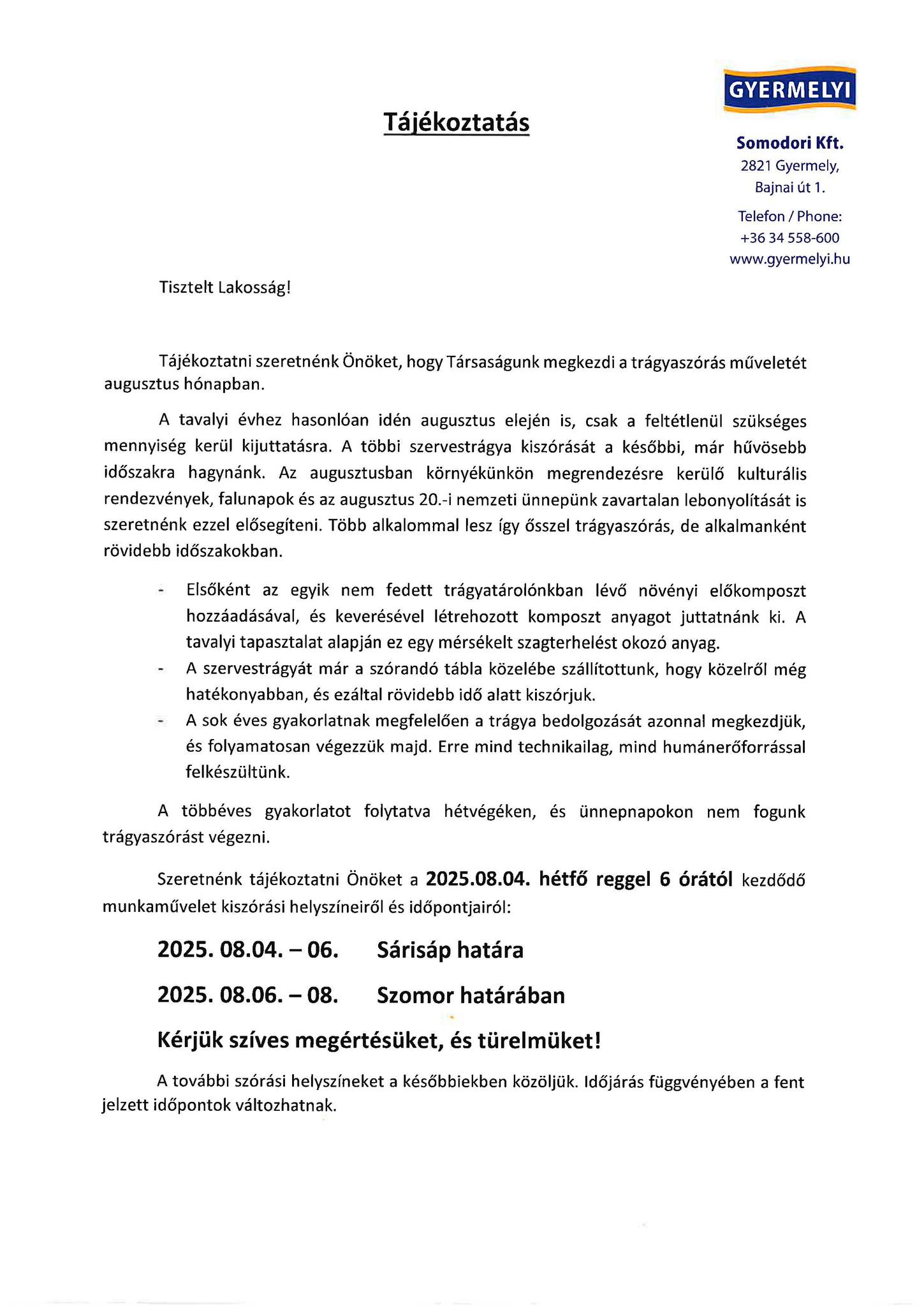 A Gyermelyi Vállalatcsoport (Gyermelyi Zrt.) Növénytermesztési Ágazata (Somodori Növénytermesztő Kft.) tájékoztatja a lakosságot, hogy 2025. augusztus 4. és 6. között Sárisáp határában, míg augusztus 6. és 8. között Szomor határában szervestrágya-szórást végeznek.