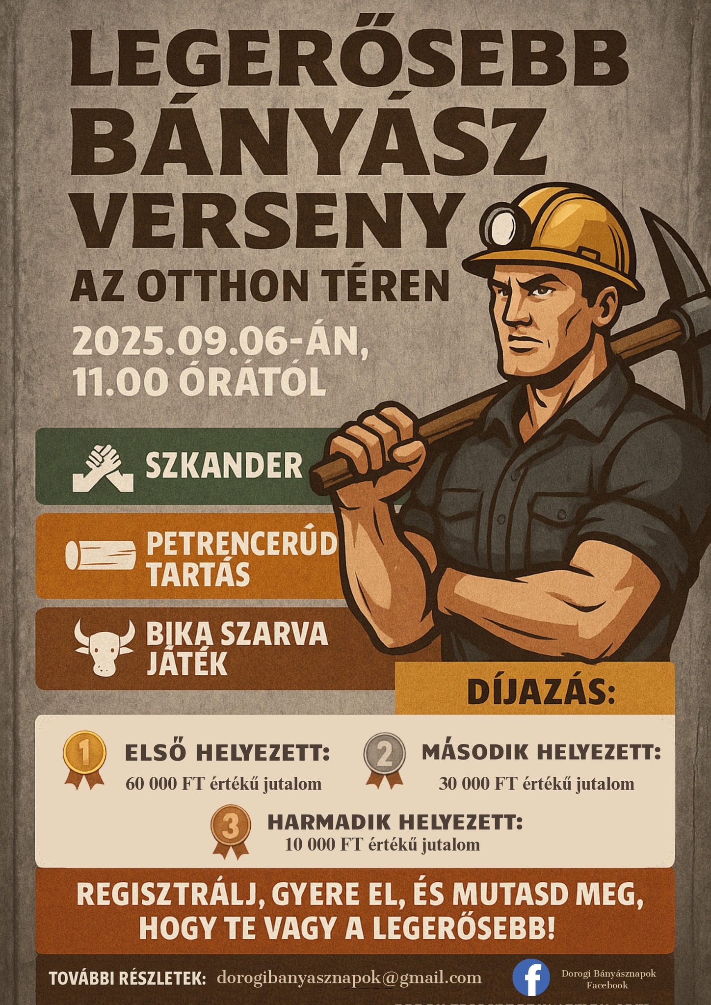 Dorogon először kerül megrendezésre a LEGERŐSEBB BÁNYÁSZ VERSENY, amelyre bátor jelentkezőket várnak. A kihívásnak az Otthon tér lesz a helyszíne, 2025. szeptember 6-án, szombaton 11 órakor.