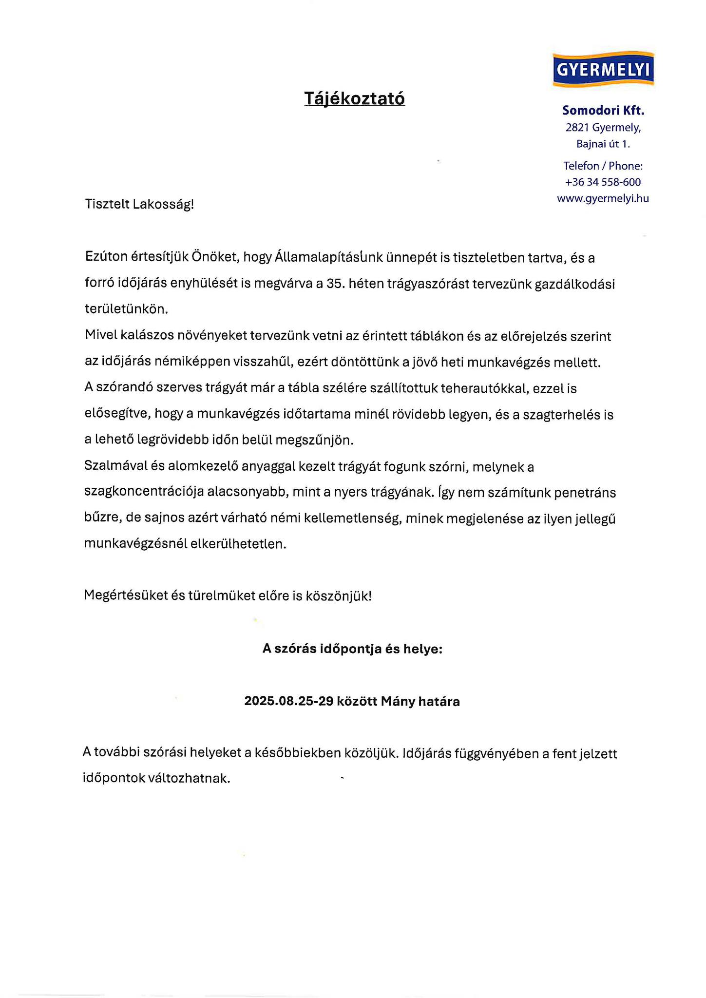 A Gyermelyi Vállalatcsoport (Gyermelyi Zrt.) Növénytermesztési Ágazata (Somodori Növénytermesztő Kft.) tájékoztatja a lakosságot, hogy 2025. augusztus 25. és 29. között Mány határában szervestrágya-szórást végeznek.