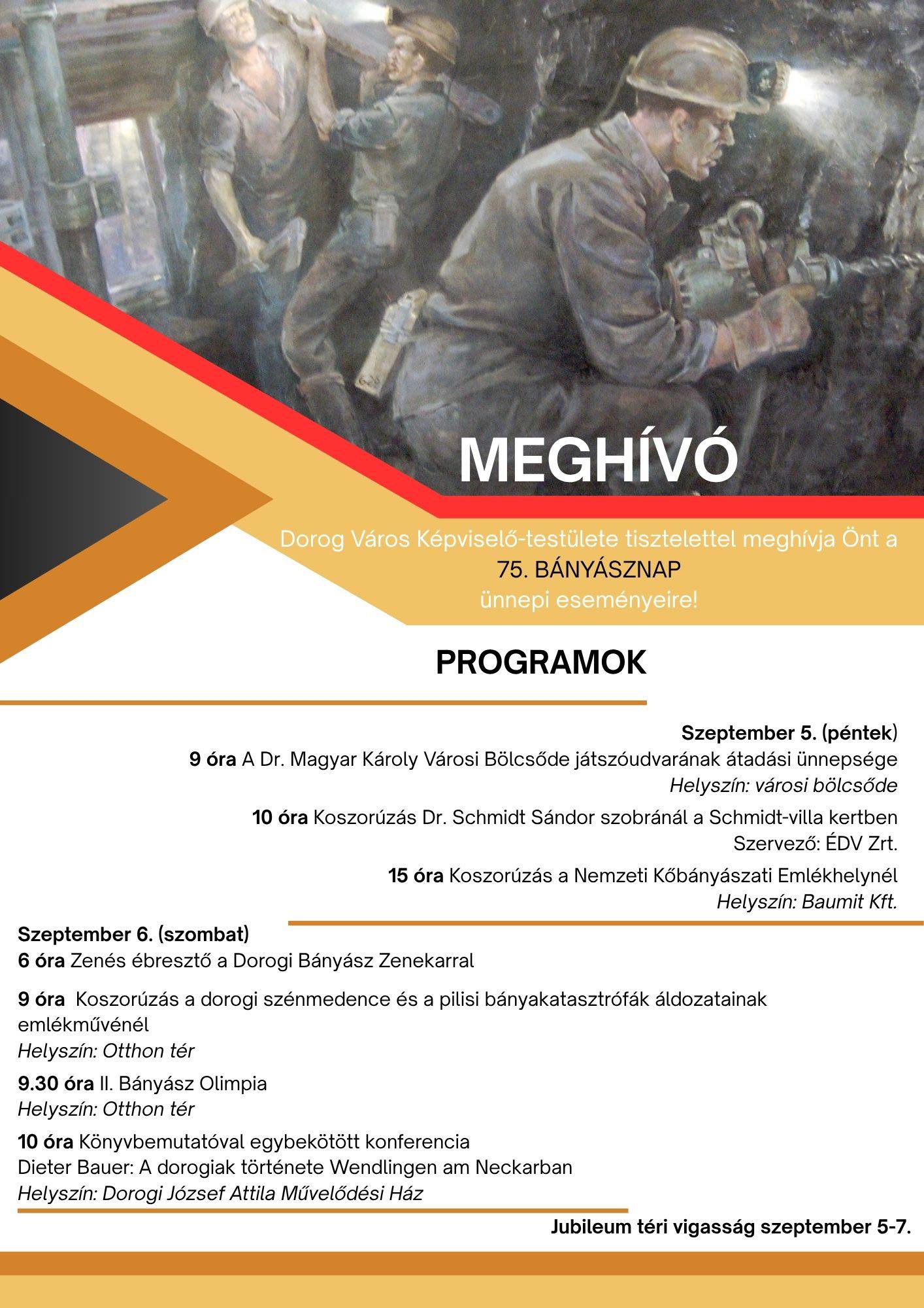 A 75. Dorogi Bányásznap eseményeit a hagyományokhoz híven ismét szeptember első hétvégéjén (5-7.) rendezik meg. Idén a Jubileum tér mellett az Otthon téren és a Reimann Miniverzumban is színes programok várják az érdeklődőket.