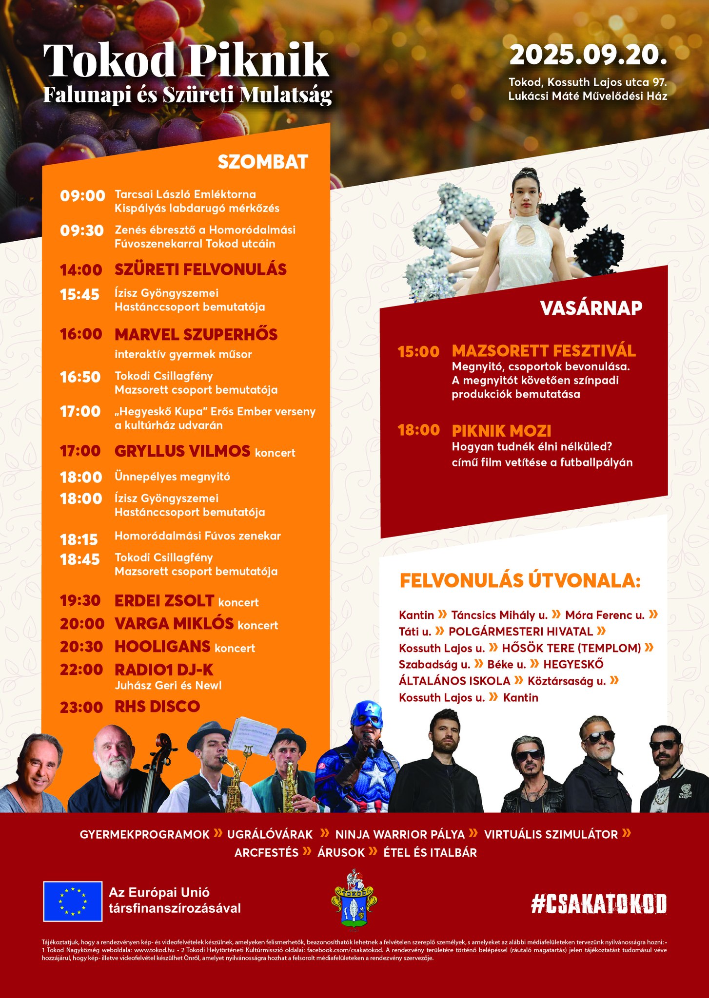 Igazi zenei nagyágyúk és gazdag programkínálat várja az érdeklődőket szeptember 20-21-én Tokodon, ahol megrendezik az idei Tokod Piknik – Falunapi és Szüreti Mulatságot. A szervezők talán minden idők legerősebb fellépőlistáját állították össze: a színpadon többek között Erdei Zsolt, Gryllus Vilmos, Varga Miklós és a Hooligans is koncertet ad. A jó hangulatról ráadásként a Rádió 1 lemezlovasai és az RHS Disco gondoskodnak.